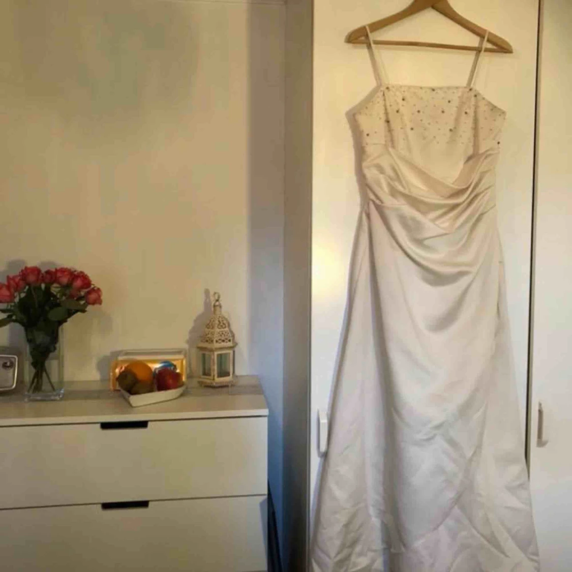 Enkel, gräddvit balklänning i vintage-stil. Knappt använd och tvättad. Går att alternera med olika toppar. Toppen på bilden kan få köpas till. Axelbanden är påsydda och enkla att ta bort. Den är fläckfri, men någon pärla kan ha trillat av intill armhålan.