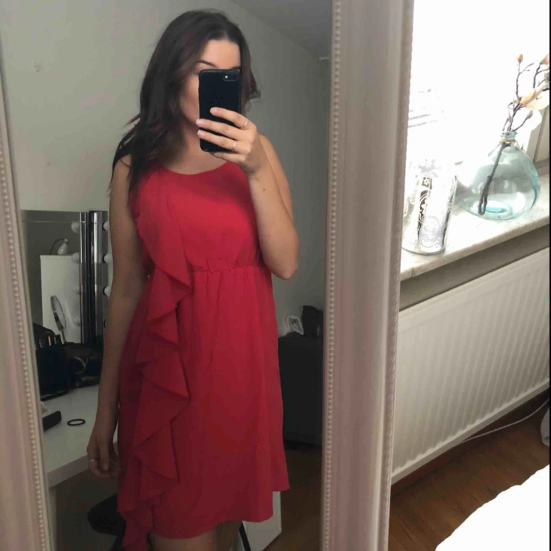 En röd klänning med en volang i bra skick. Köparen står för frakten:)
