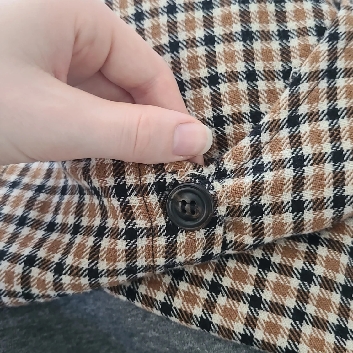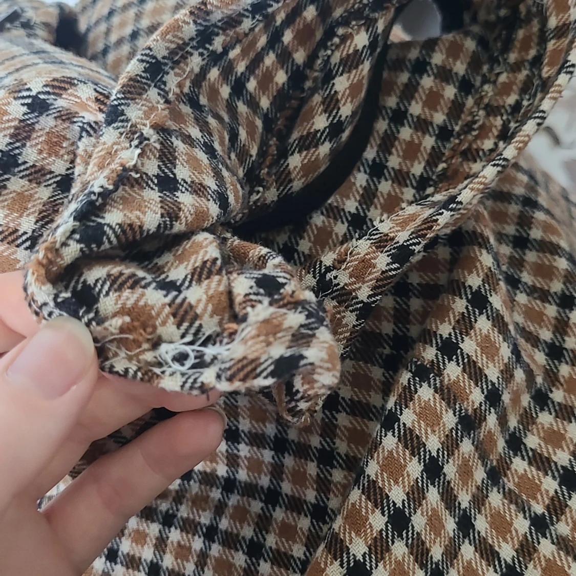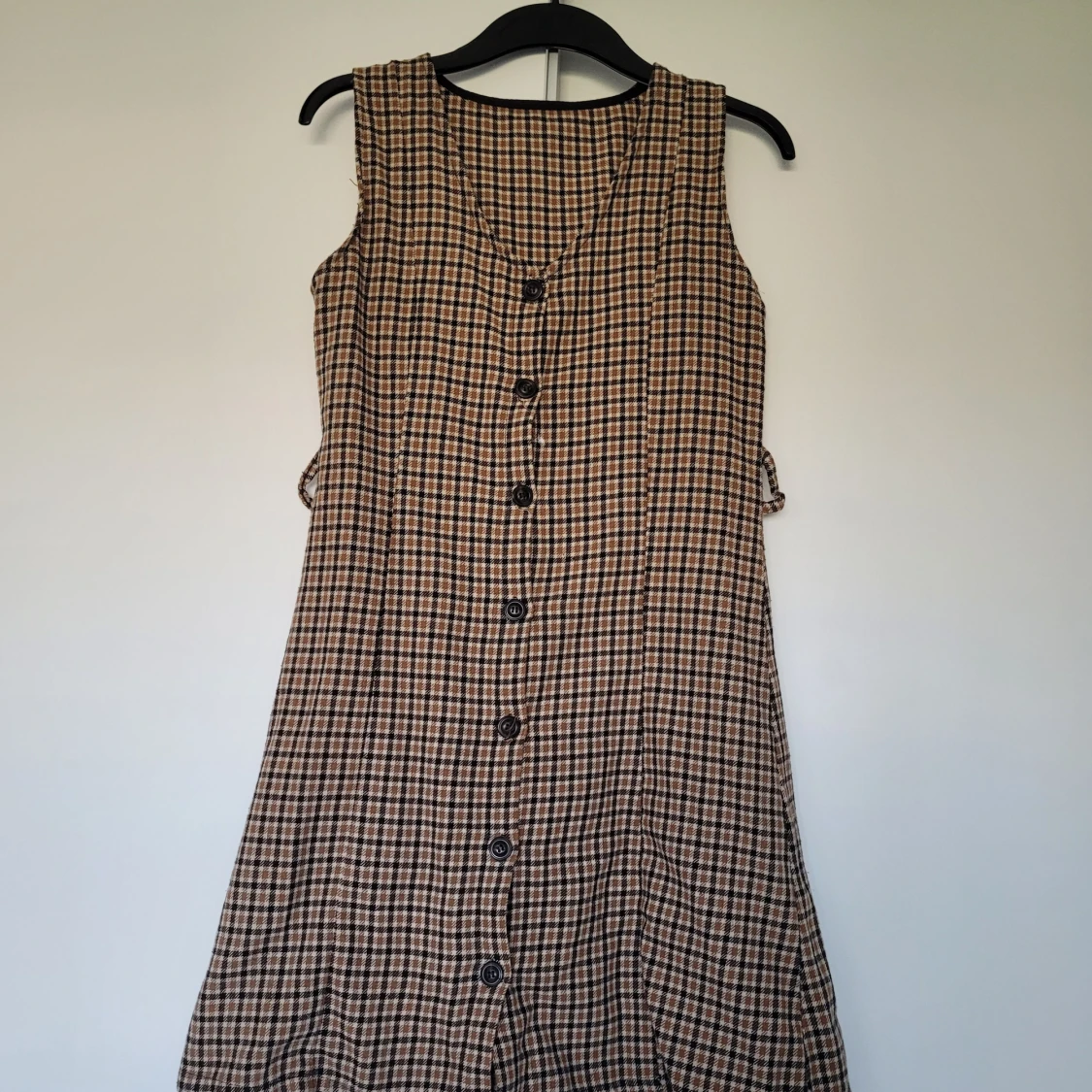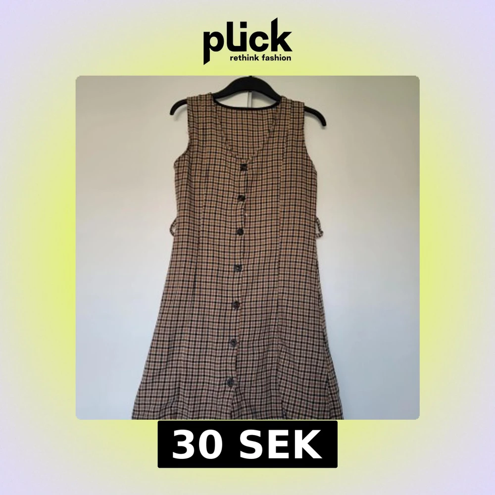 Säljer en söt ärmlös kortklänning med rutigt mönster i beige, svart och vitt. Klänningen har knappar hela vägen framtill och en lätt A-linjeformad siluett. Den ser ut att vara hemmasydd och har pga slitage en del defekter, främst vid armhålen och knapparna (se bilder för exempel). Skriv gärna vid frågor.