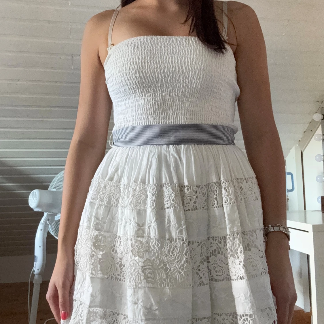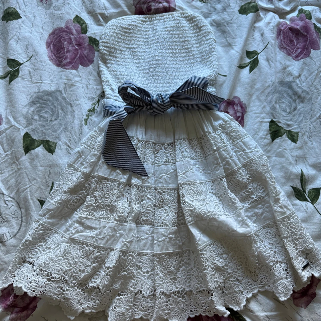 Superfin vit kortklänning med smockad överdel och tunna axelband. Den är ifrån Abercrombie & Fitch. Kjolen har flera lager med spetsdetaljer och en bred, randig rosett i midjan. Perfekt för sommarens alla tillfällen! Materialet är mjukt och luftigt bomull.