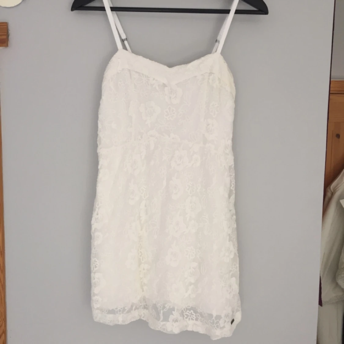 En kort spetsklänning i vitt från Abercrombie & Fitch. I begagnat men fint skick. Det står storlek S i klänningen, men jag skulle säga att den passar bättre till en XS. 60kr +frakt