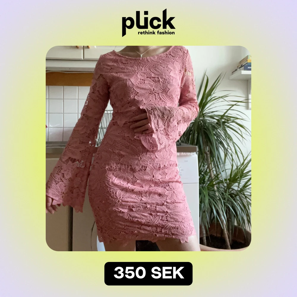 Rosa spetsklänning med vackert blommönster. Den har en dragkedja på sidan och har använts två gånger. Är en aning stor för mig som brukar ha XS🌸