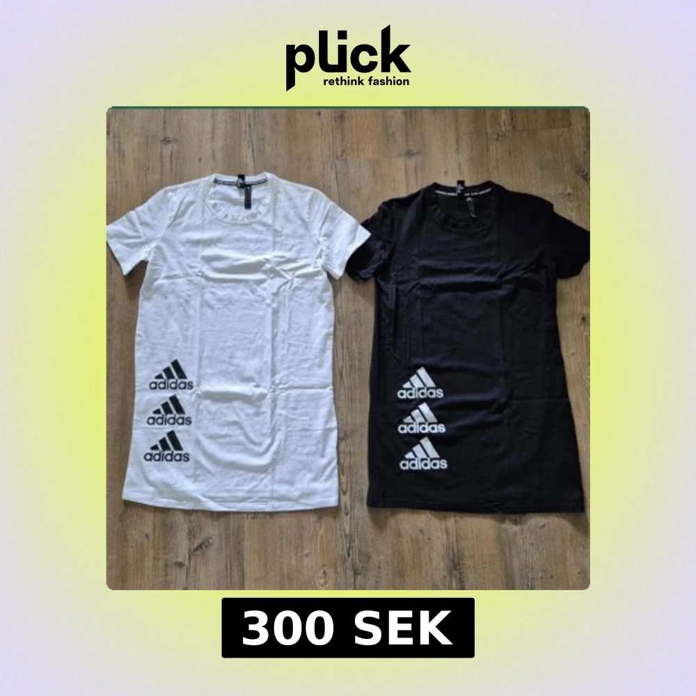 Två t-shirtklänningar från Adidas, en i vitt och en i svart. Båda har rund halsringning, korta ärmar och tre stora Adidas-loggor tryckta längs ena sidan. Skön bomullskänsla och avslappnad passform, perfekt för en sportig look.