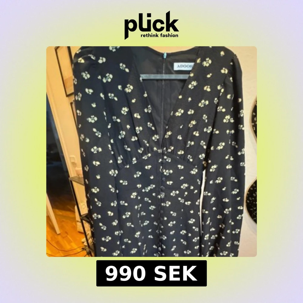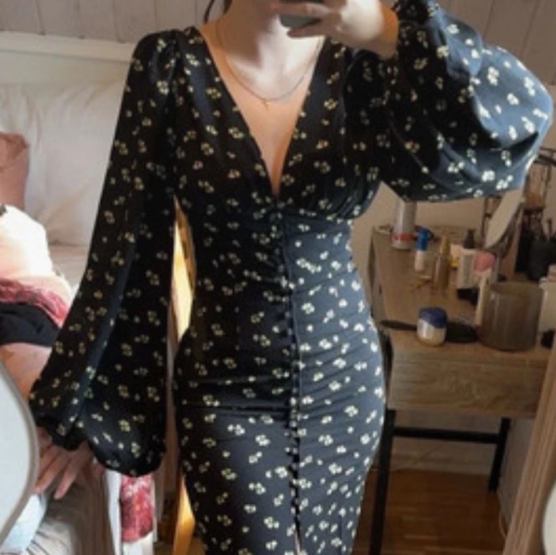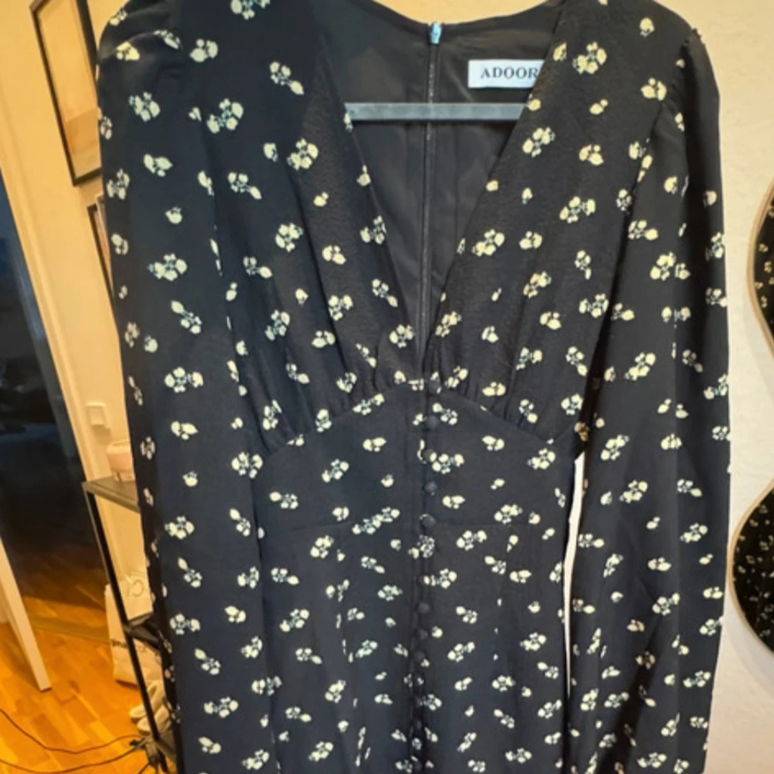Supersnygg svart långklänning från Adoore med små vita blommor, markerad midja och v-ringning. Klänningen har långa puffärmar och knappar längs hela framsidan. Perfekt för dig som gillar romantisk och trendig stil.