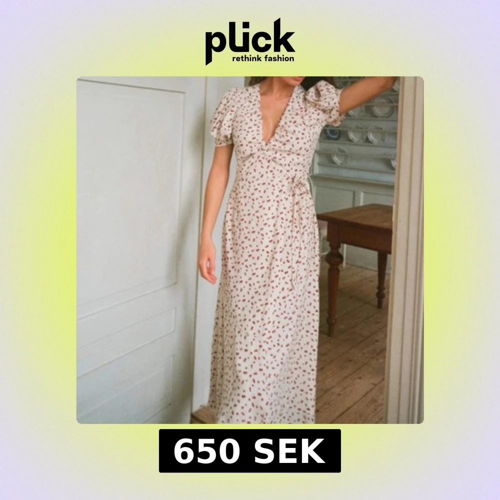 Söt långklänning i ljus färg med små röda körsbär, omlottmodell och knyt i midjan. Klänningen har puffiga kortärmar och djup v-ringning. Perfekt för sommarens alla tillfällen. Passar S !