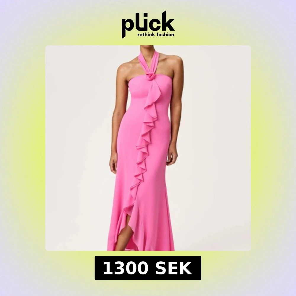 Supersnygg rosa långklänning från Adoore med halterneck och volangdetalj framtill. Klänningen har en elegant omlottkänsla och en rosformad knut vid halsen. Perfekt för dig som vill sticka ut med en feminin och trendig look.