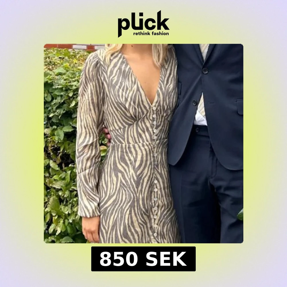 Snygg zebramönstrad klänning från Adoore i beige och brunt. Klänningen har v-ringning, långa ärmar och knappar framtill. Den är figurnära upptill och har en lätt utställd kjol som slutar under knät. Storlek 34. Perfekt för dig som vill sticka ut med ett coolt mönster. Använd en gång. Nypris 1700kr.