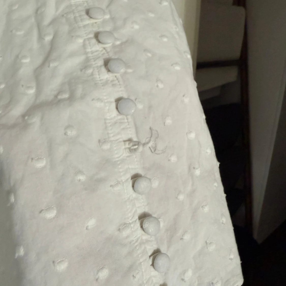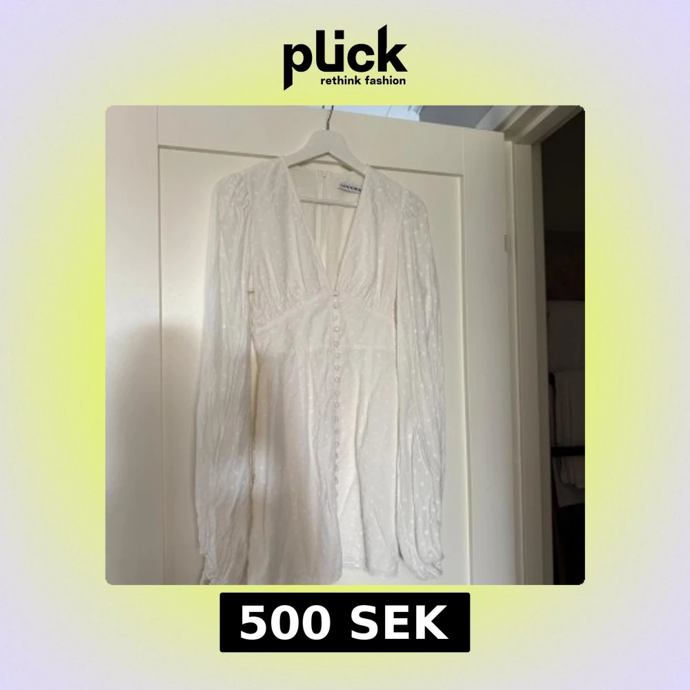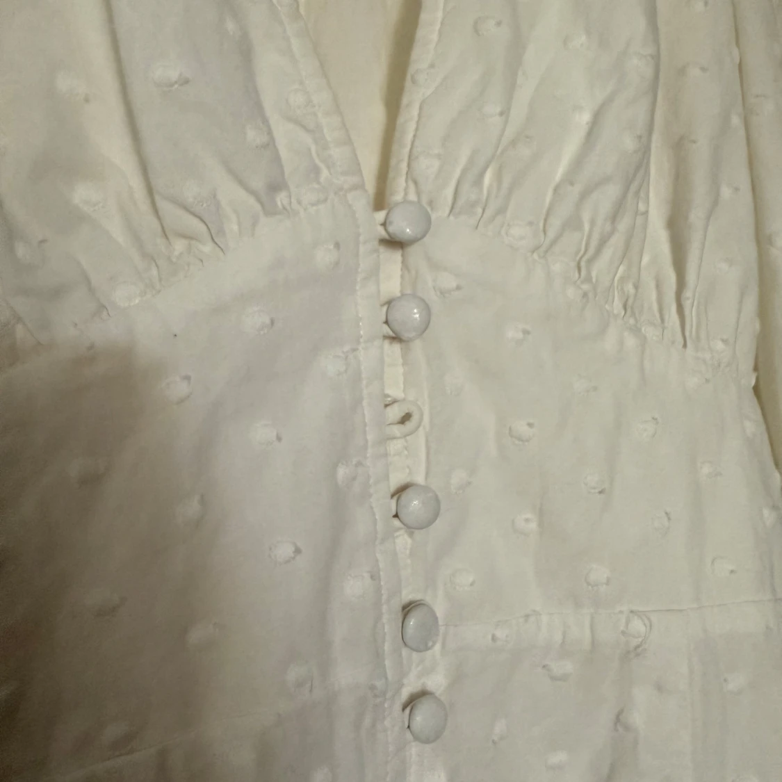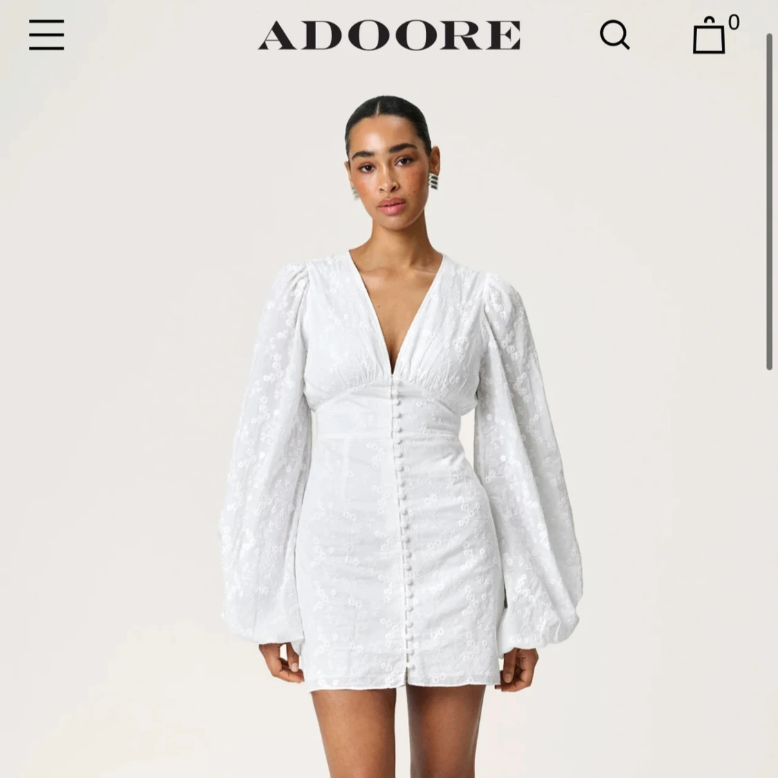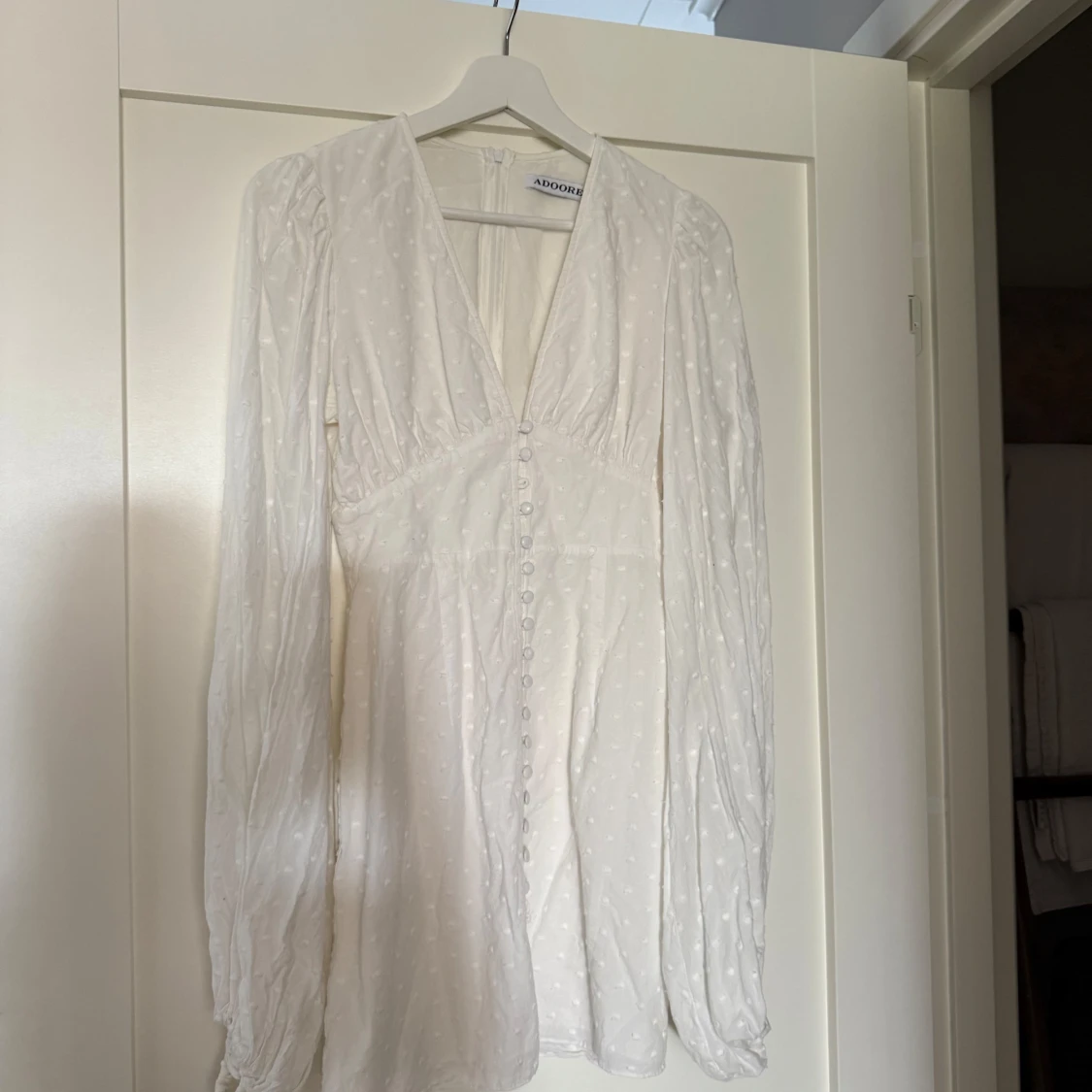 Supersöt vit kortklänning från Adoore med v-ringning, puffiga långärmar och täckta knappar framtill. Klänningen har diskret prickigt mönster i tyget och markerad midja för en snygg siluett. Använd 1 student och 1 midsommar. Tvättad en gång. Jättefint skick förutom 2 knappar som ramlat av. Går att köpa nya och sy fast för den händige. Kan mötas på Ekerö annars skickar jag och köparen står för frakt.