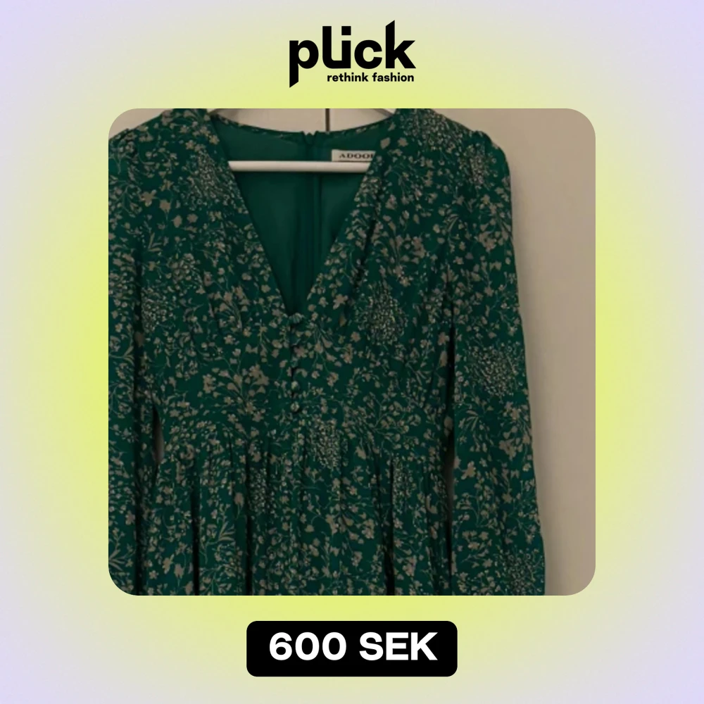 Säljer en superfin grön långklänning från ADOORE med ett vackert blommigt mönster. Klänningen har en v-ringad hals och långa ärmar, perfekt för både vår och sommar. Den är i fint skick och passar perfekt till festliga tillfällen!