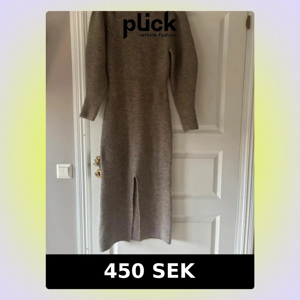Mysig beige stickad långklänning från Adoore med lång ärm och midja. Klänningen har en ribbad struktur och en snygg slits framtill som ger extra edge. Använd en gång. Som ny