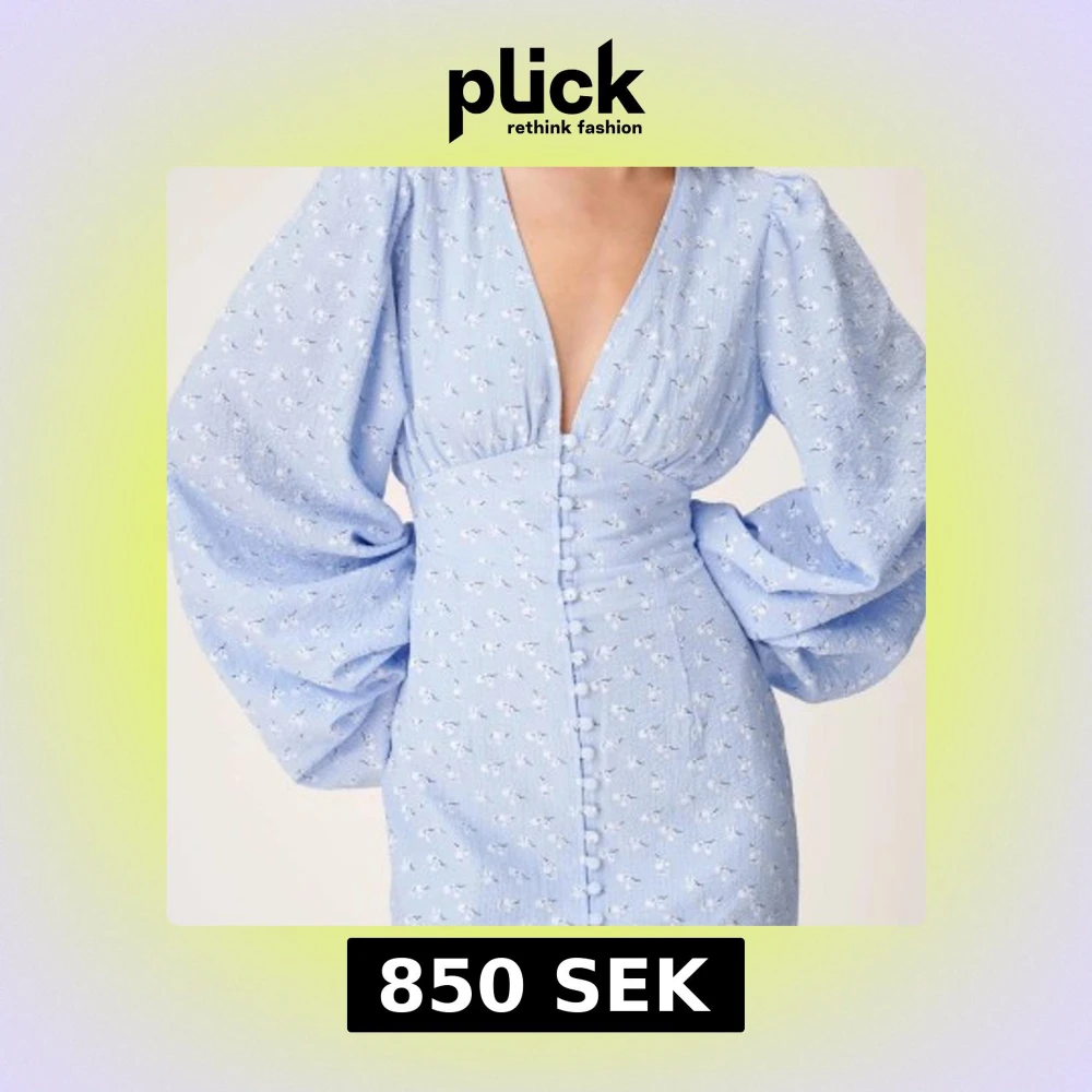 Säljer en elegant ljusblå klänning med djup v-ringning och puffiga långärmar. Klänningen har knappar framtill. Använd en gång!