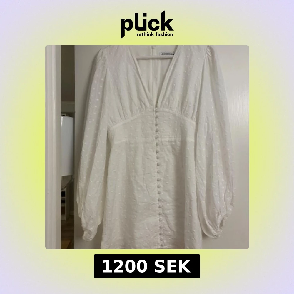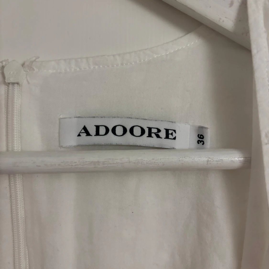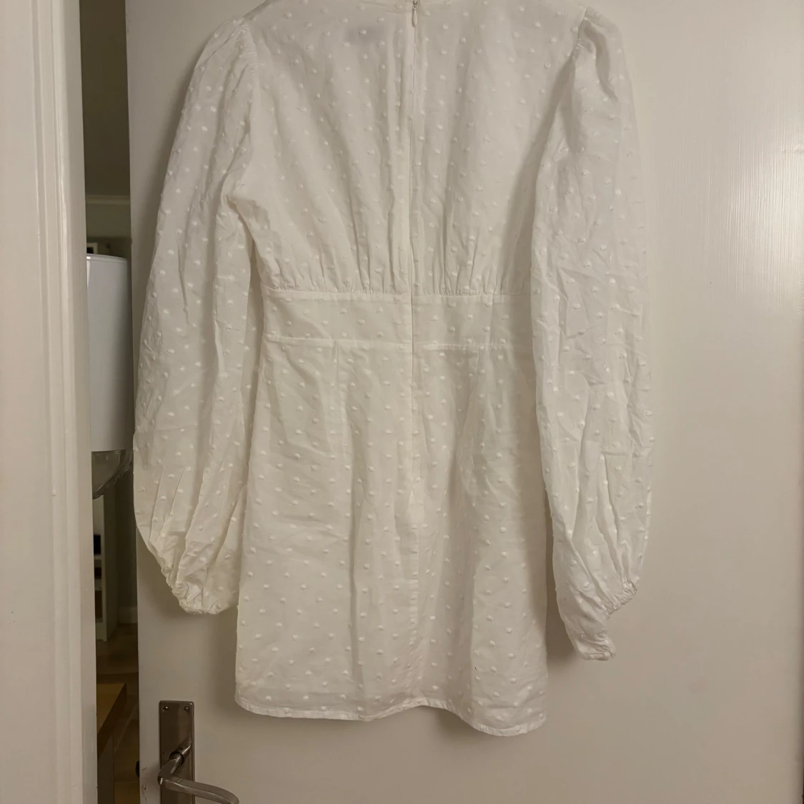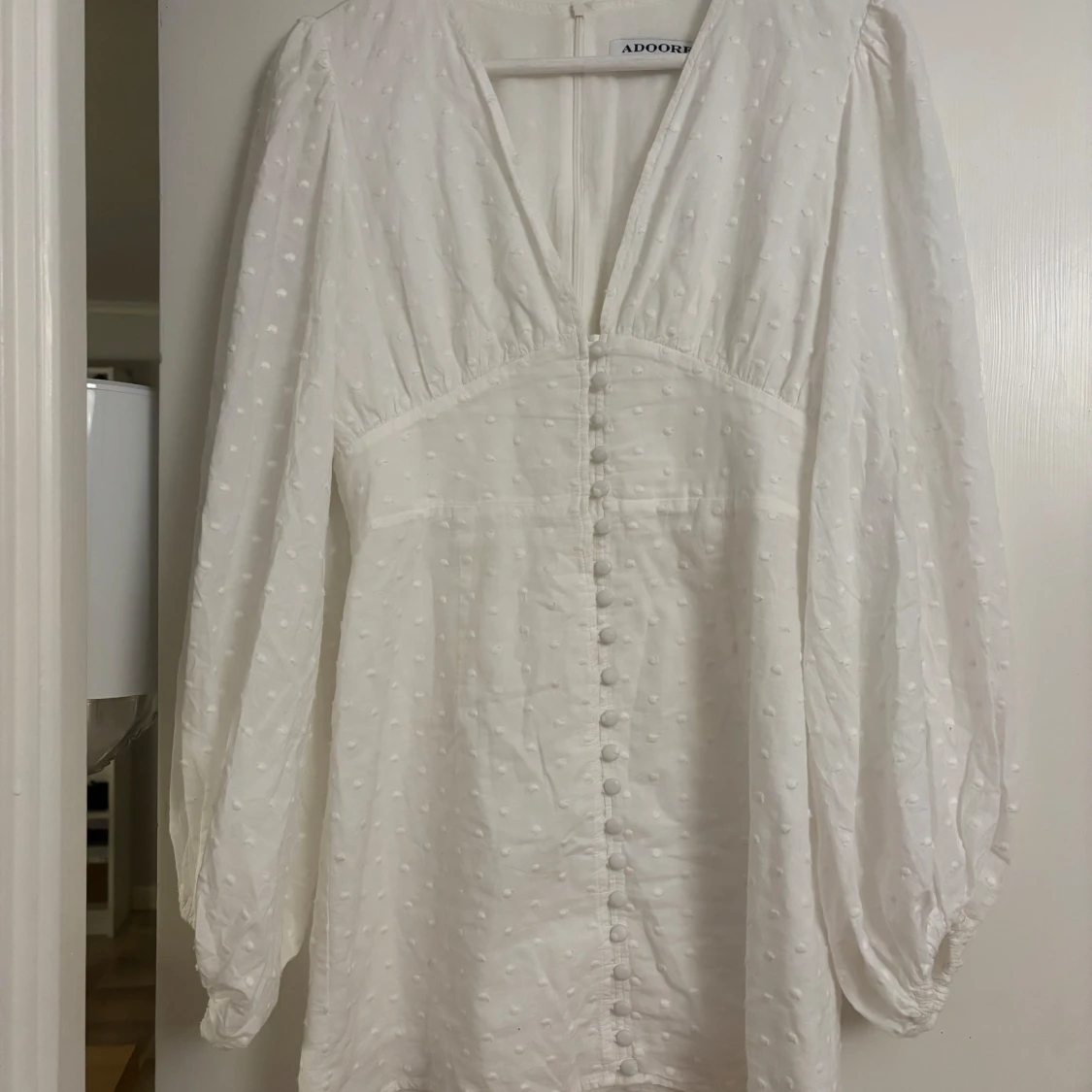 Superfin vit kortklänning från Adoore med v-ringning, långa puffärmar och dekorativa knappar framtill. Klänningen har diskret prickigt mönster i tyget och markerad midja för en snygg siluett. Perfekt för sommarens alla tillfällen!