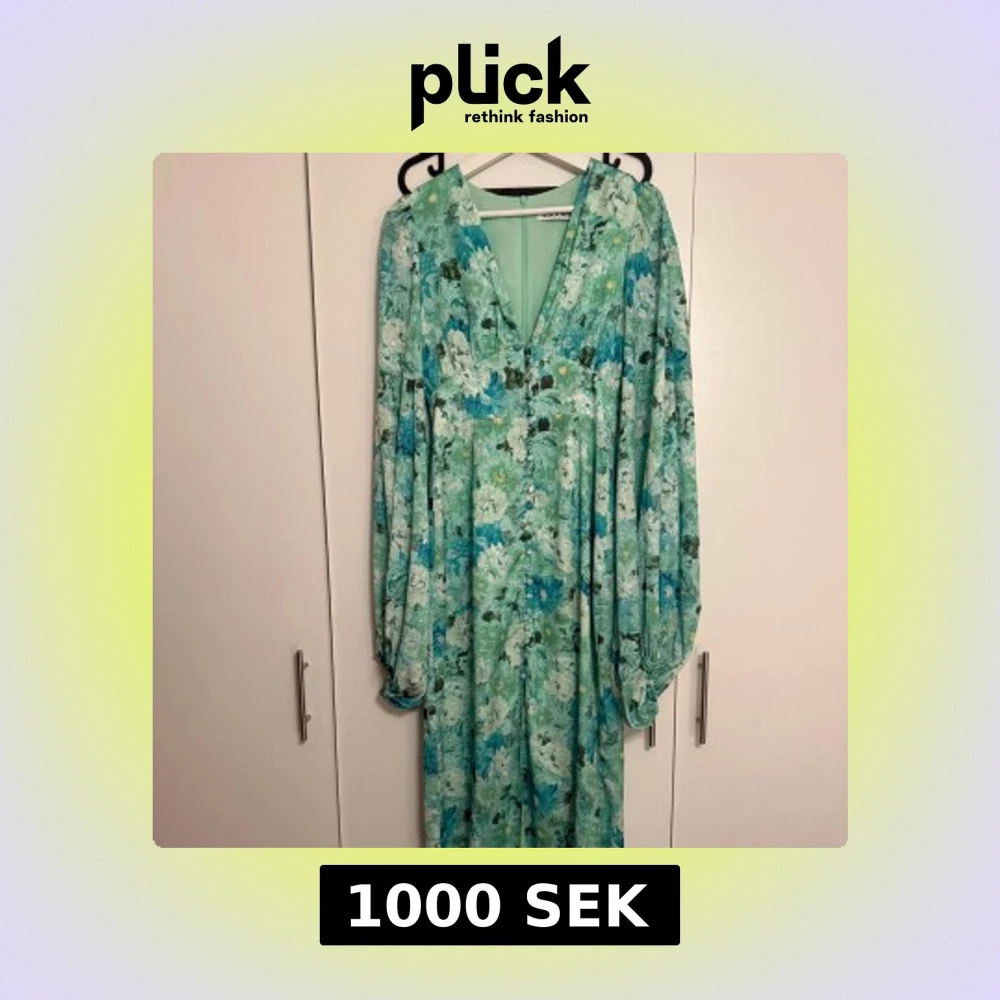 Säljer en superfin långklänning från Adoore med blommigt mönster i gröna och blå toner. Klänningen har v-ringning, långa puffärmar och knappar framtill. Perfekt för dig som vill ha en flowy och färgglad look.