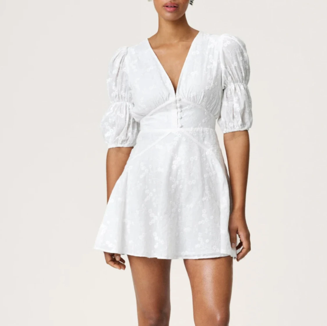 Superfin vit kort klänning med puffiga halvlånga ärmar, v-ringning och knappar framtill. Använd 2 gånger💕