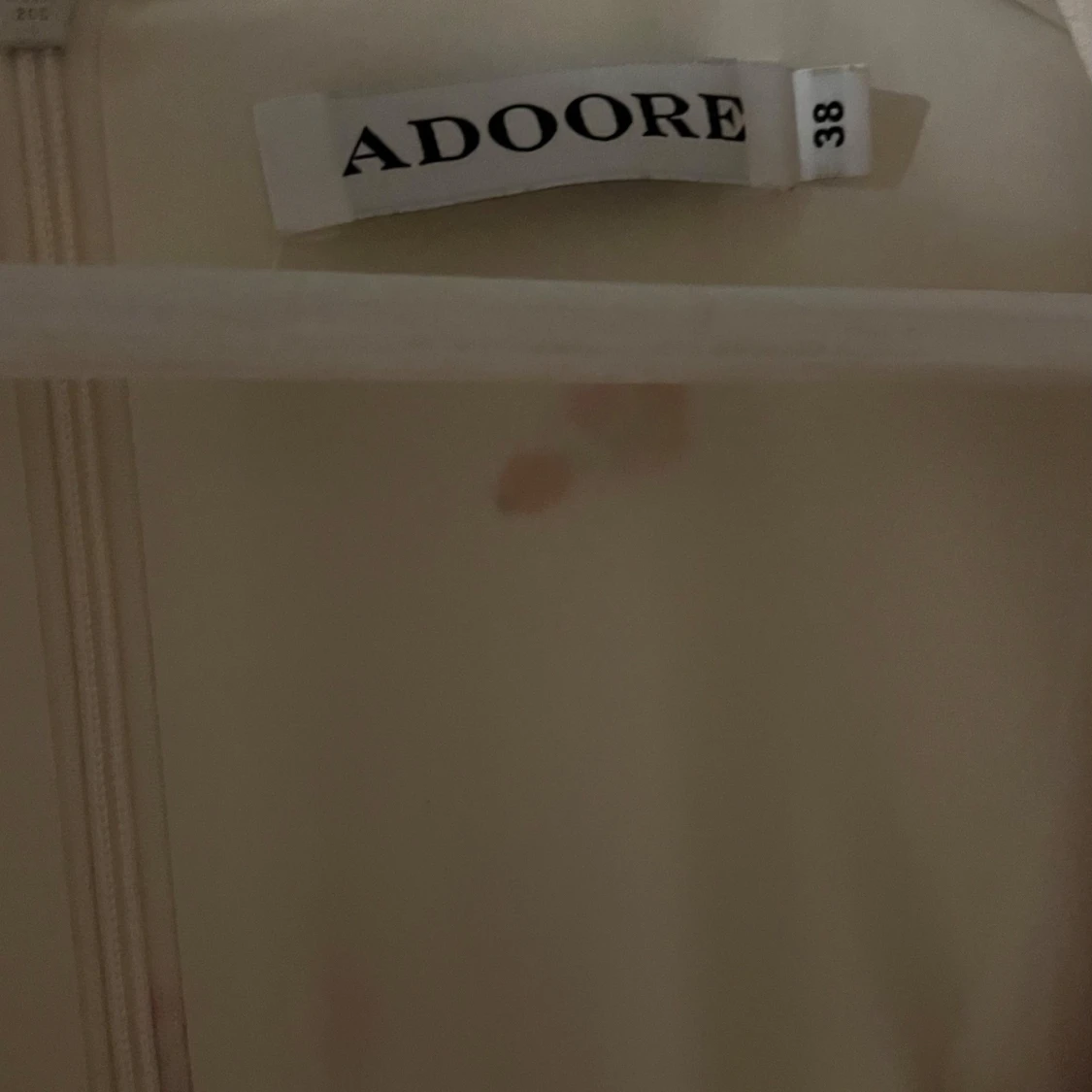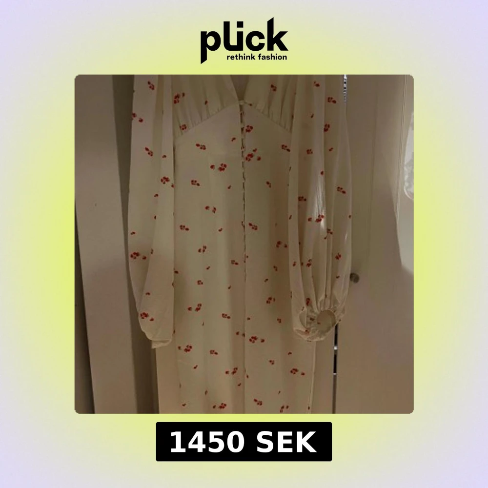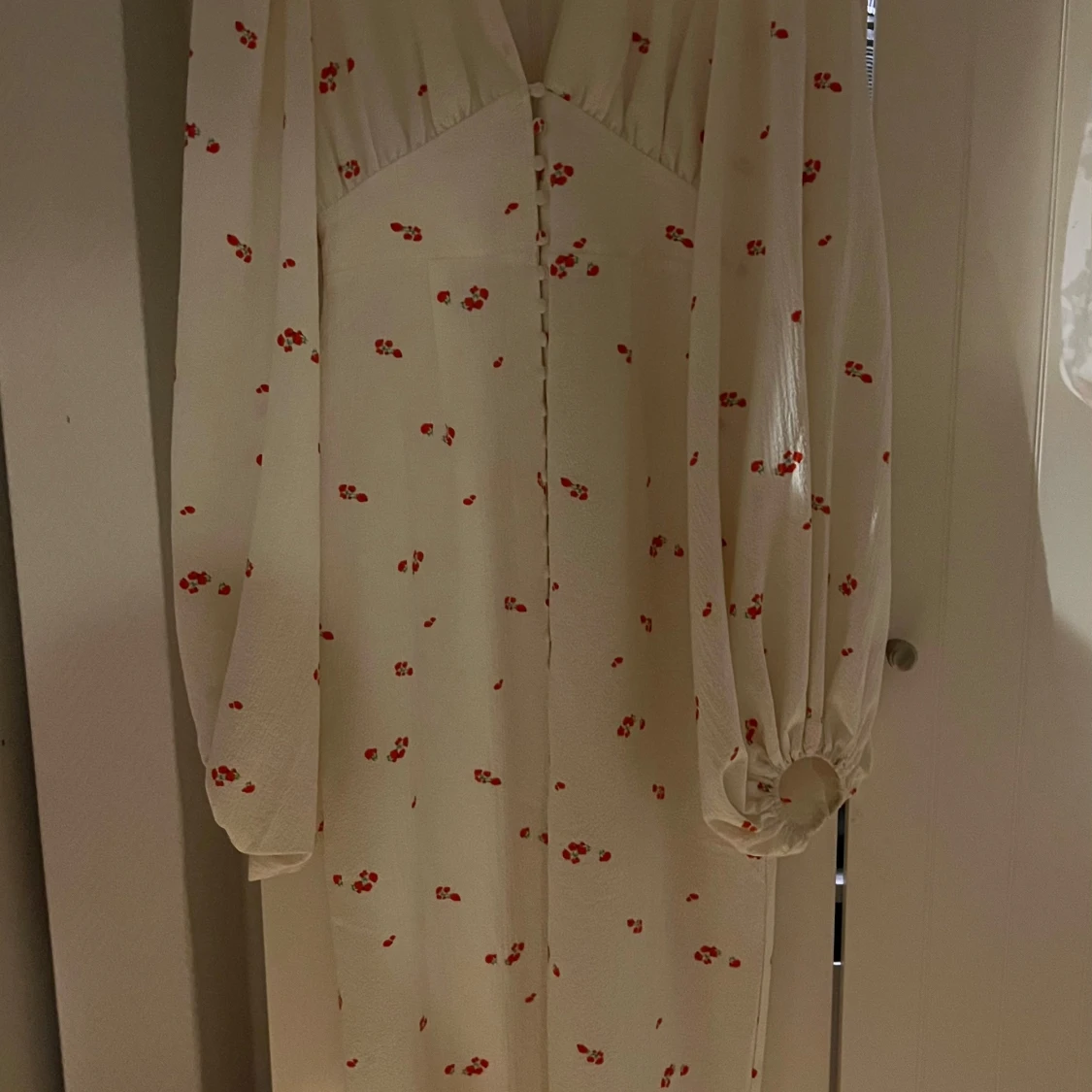 Säljer en superfin vit långklänning från Adoore med små röda blommor. Klänningen har långa puffärmar med resår vid handlederna och knappar framtill. Perfekt för dig som gillar romantisk stil och vill sticka ut med ett gulligt mönster.