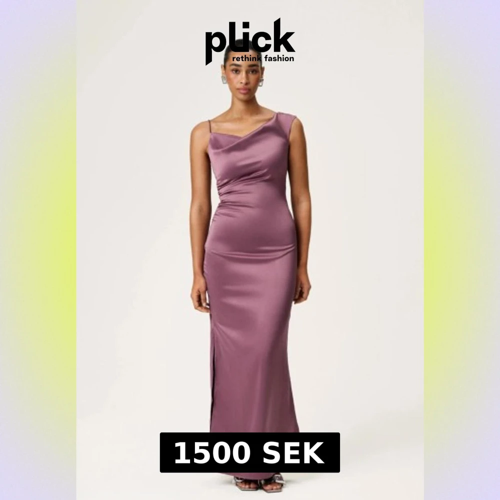 Elegant lila långklänning i satin med smala axelband och asymmetrisk halsringning. Klänningen har en slits på sidan och figurnära passform som framhäver siluetten. Perfekt för dig som vill ha en stilren och modern look. Helt oanvänd och inte upppaglad ur förpackningen