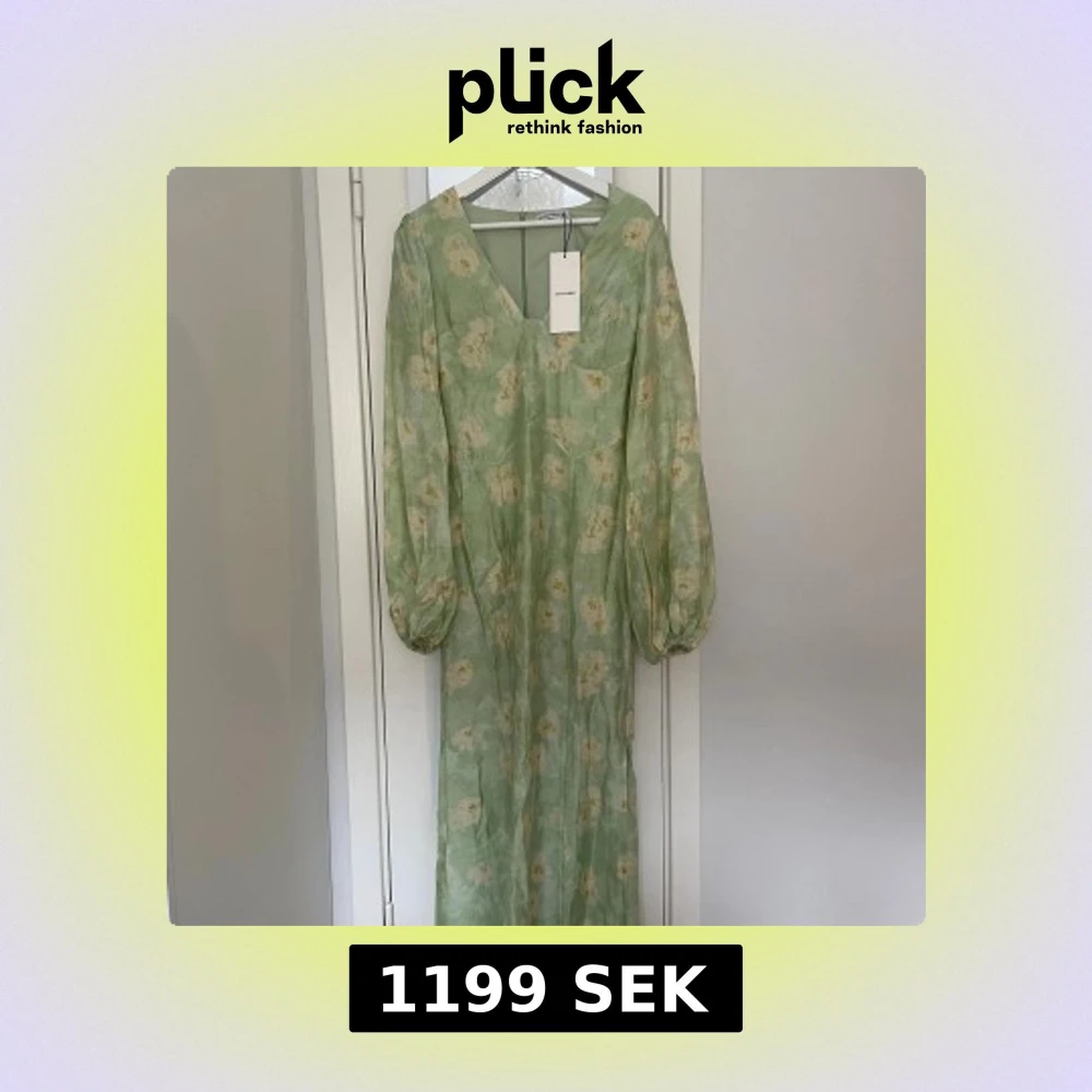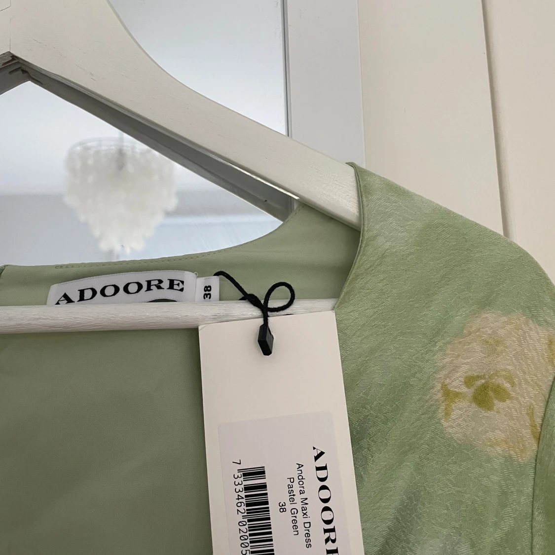 Pastelgrön långklänning från Adoore med v-ringning och långa puffärmar. Klänningen har ett romantiskt blommigt mönster i vitt och gult, och är tillverkad i ett lätt, glansigt material som ger en lyxig känsla. Perfekt för dig som gillar en feminin och trendig stil. Den är helt oanvänd med alla lappar kvar!