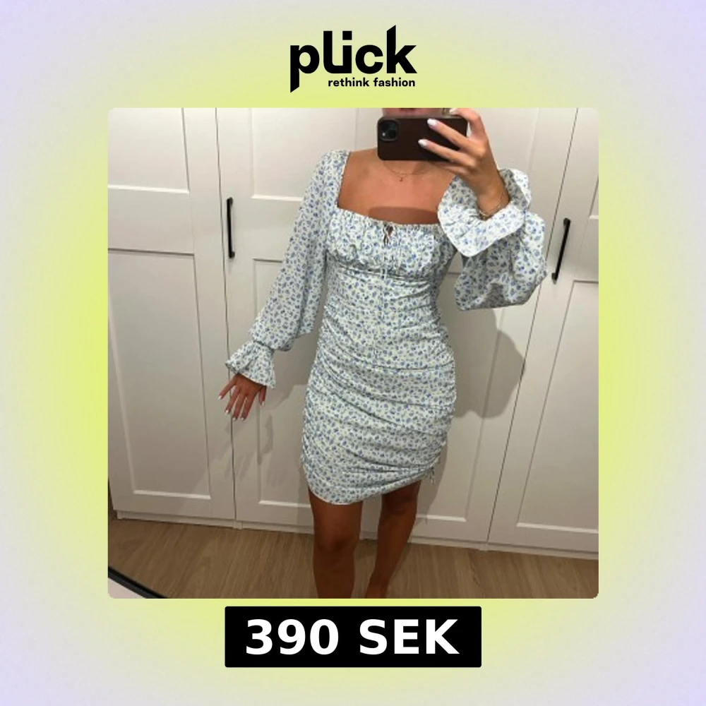 Supersöt kortklänning från Adoore med ljusblått blommönster på vit botten. Klänningen har långa puffärmar, fyrkantig ringning och smickrande rynkade detaljer. Perfekt för sommarens alla tillfällen!