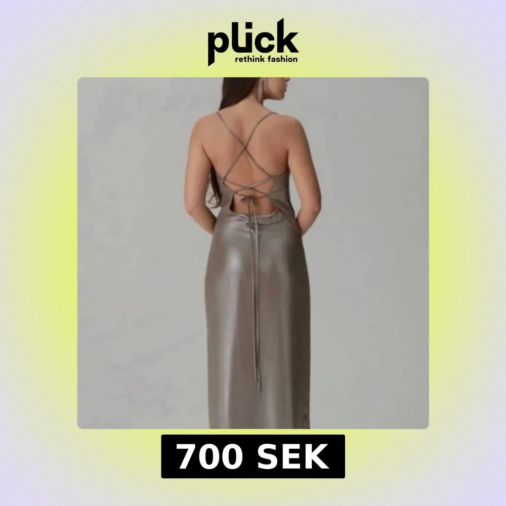 Elegant silverfärgad långklänning med smala axelband och en stilren slits framtill. Klänningen har en öppen rygg med snörning som ger en sofistikerad look. Perfekt för festliga tillfällen🩶Klänningen är endast testad, så prislapp är kvar! Säljer på grund av för stor storlek. Nypris: 1595kr