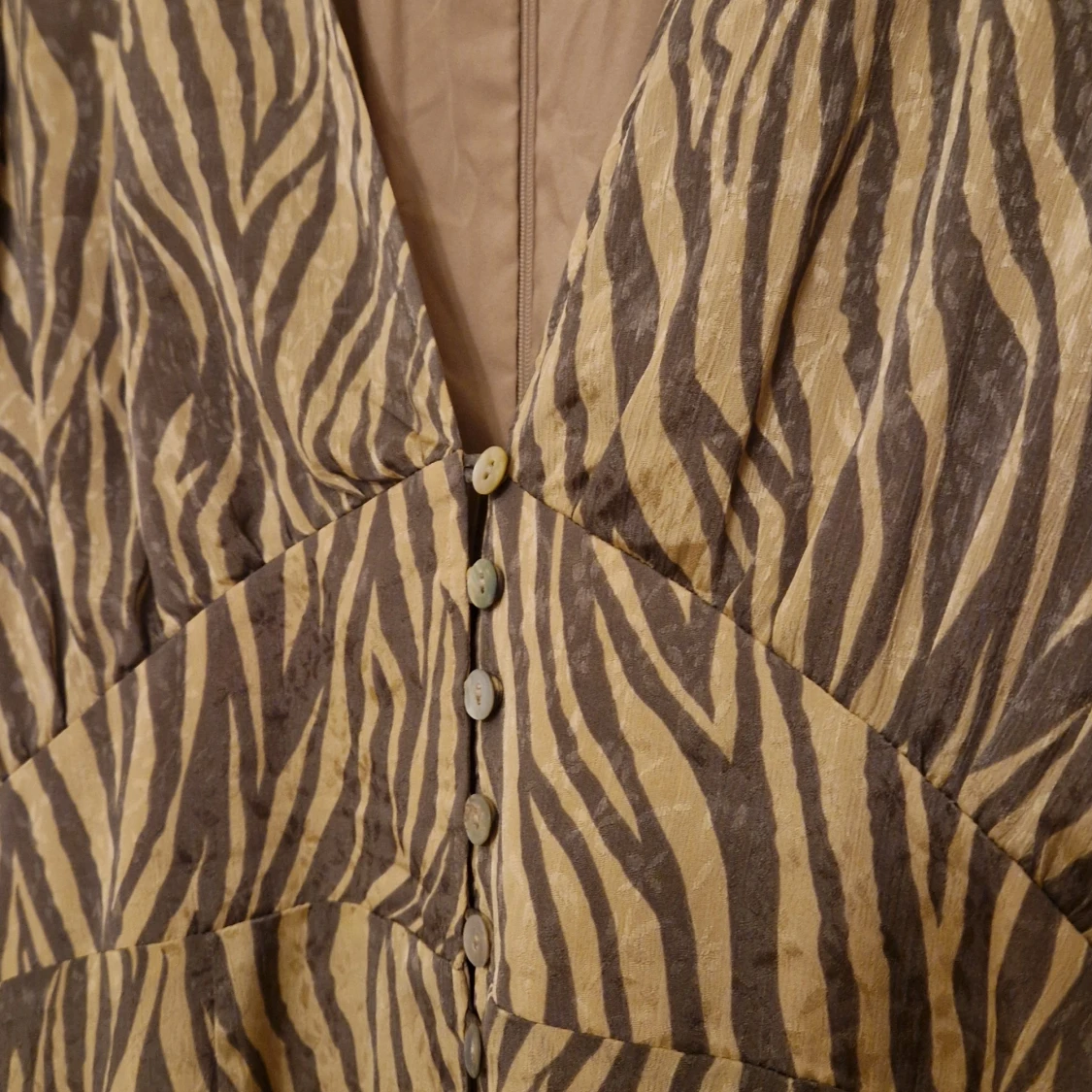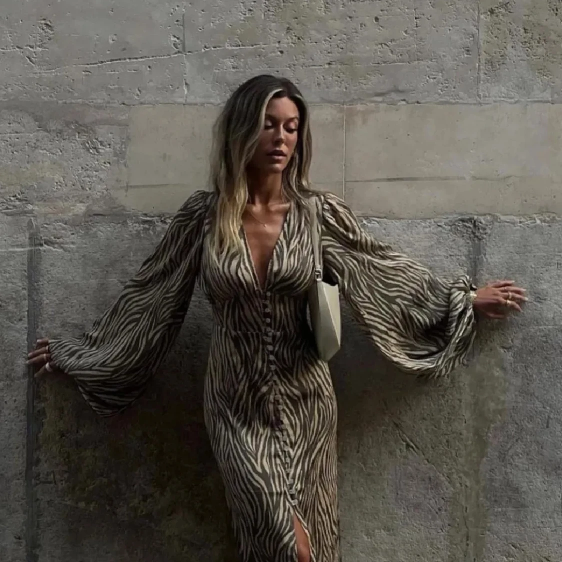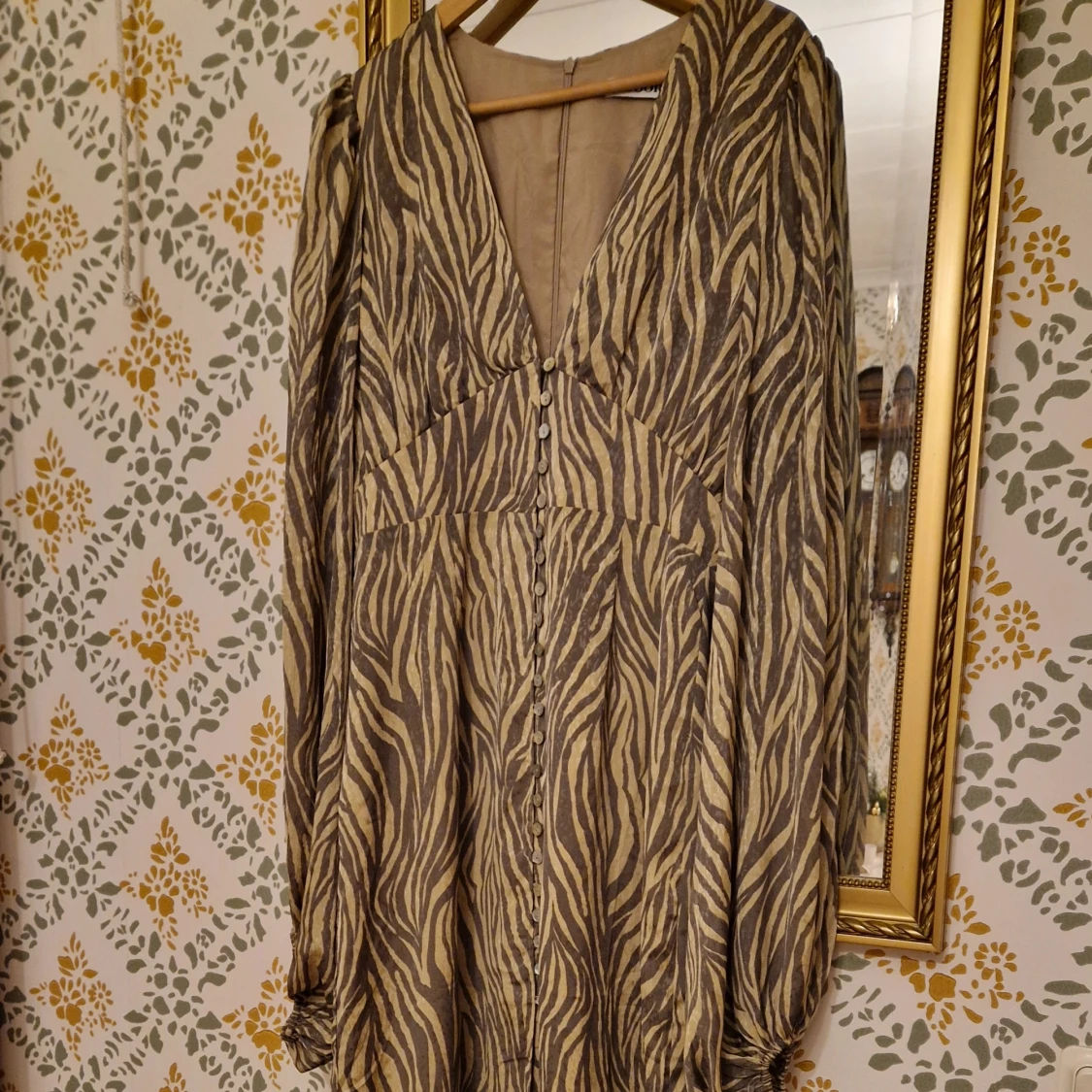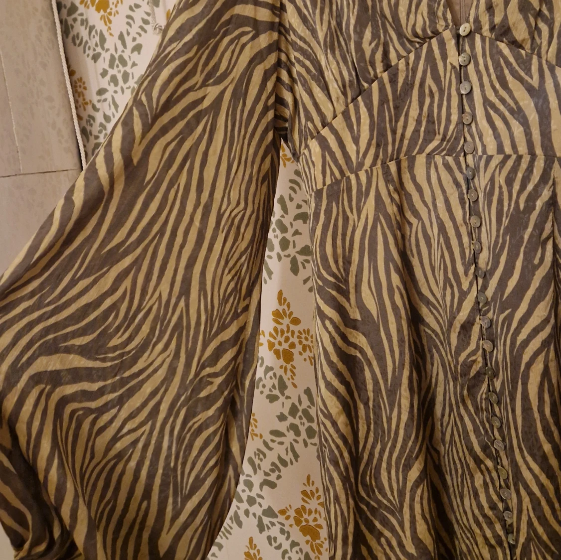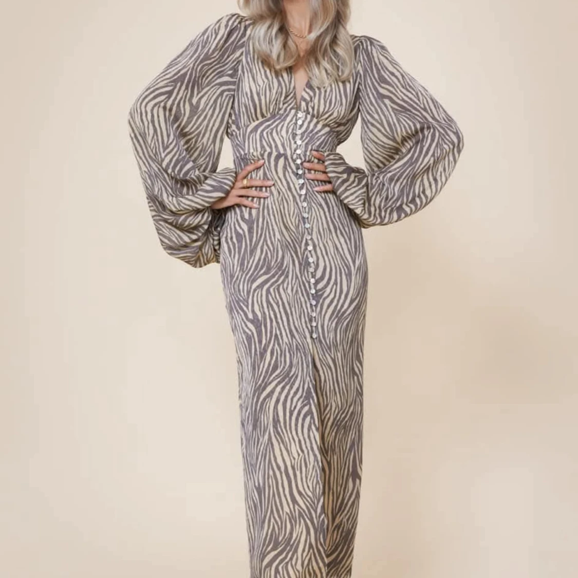 Säljer en snygg zebramönstrad långklänning från Adoore, modell Positano. Klänningen har långa balongärmar och en v-ringad design med knappar framtill. Ny utan lappar. Inga anmärkningar. Liten i storleken. Se hemsidan för storleksguide https://adoore.se/products/positano-dress-zebra