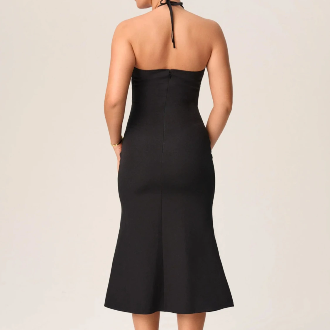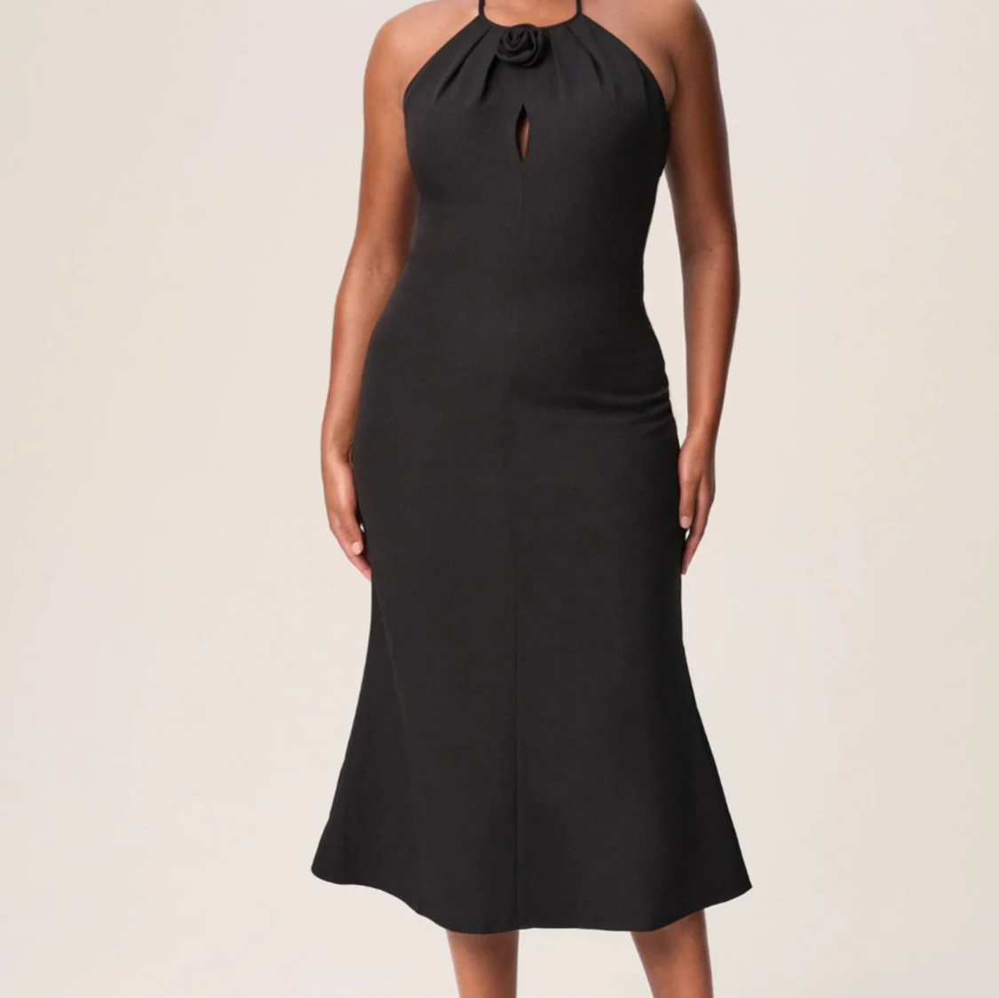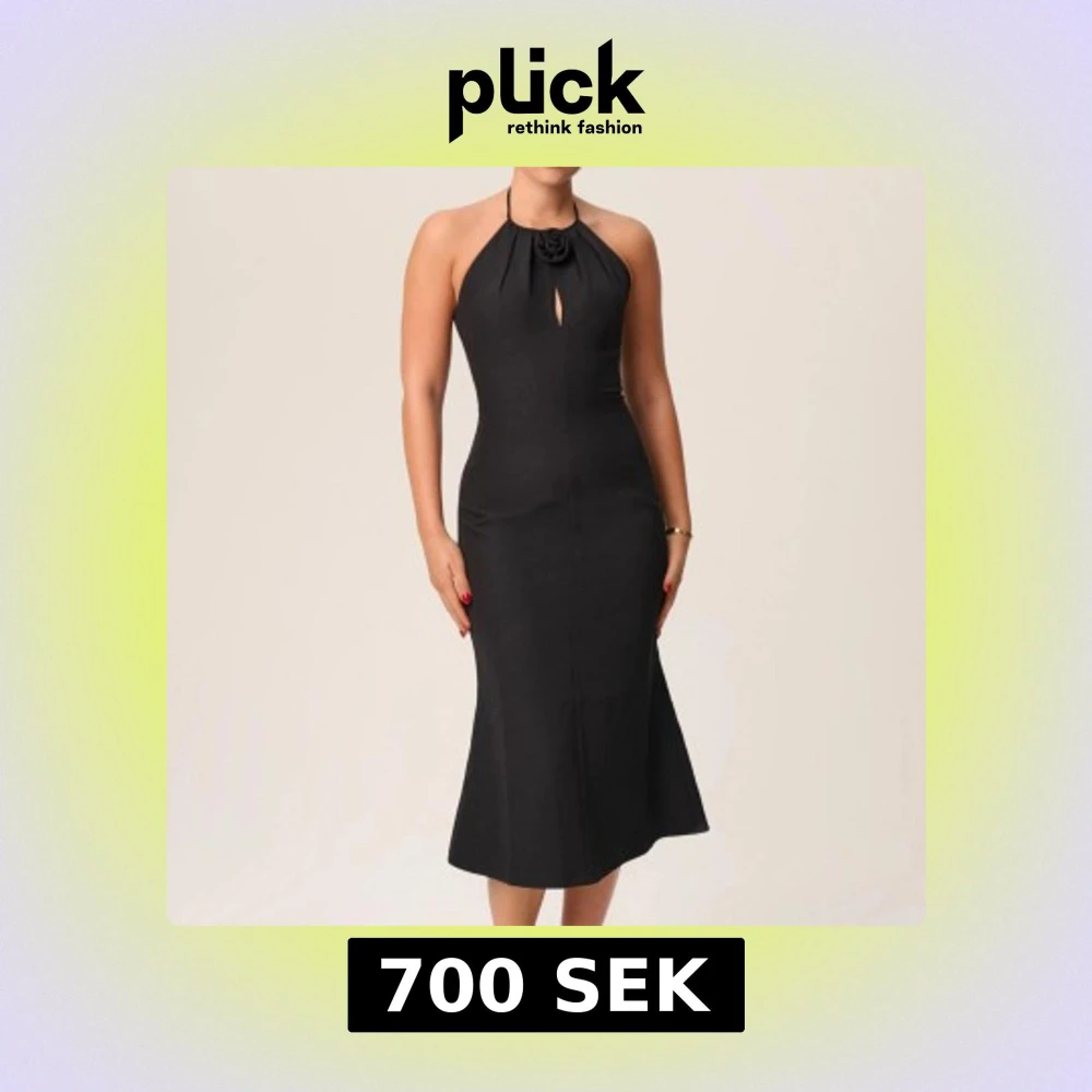 Rozzano midiklänning. Den här klänningen har en halterneckringning med ett droppformat utskärningsdetalj, kompletterat med ros- och plisserade detaljer. Den öppna ryggen, timglassilhuetten och slitsen baktill skapar en elegant look för alla tillfällen. Klänningen är helfodrad och har en dold dragkedja i ryggen. Helt ny med lapparna kvar!❤️ Mötes upp och bytes mot en annan modell adoore i storlek 36. Eller säljs! ❤️‼️till anklarna på mig som är 160.