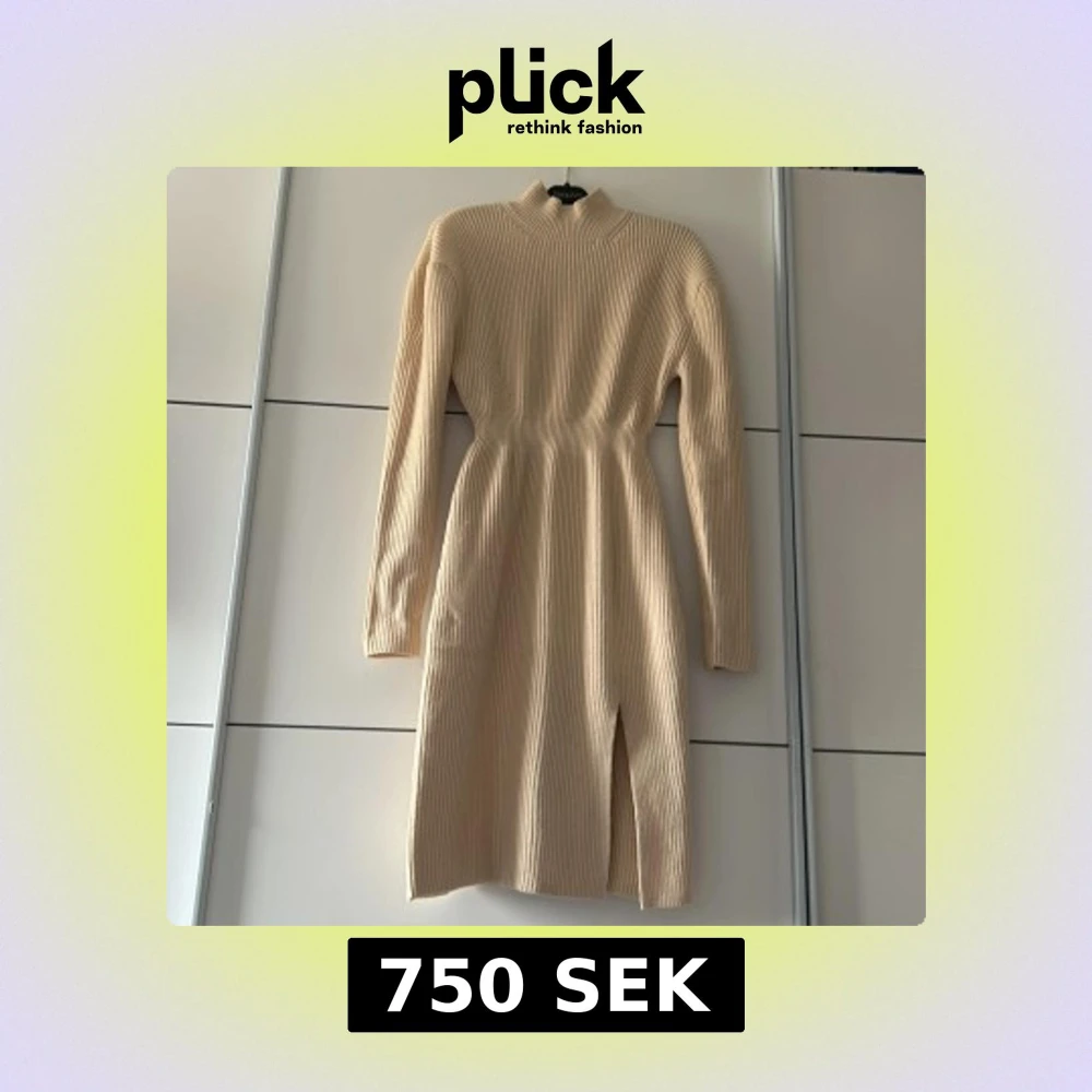 Säljer en beige ribbstickad klänning från Adoore i storlek 40. Klänningen har lång ärm, hög hals och en snygg slits framtill. Den är figurnära och passar perfekt till kyligare dagar. Lite liten i Storleken så passar 38