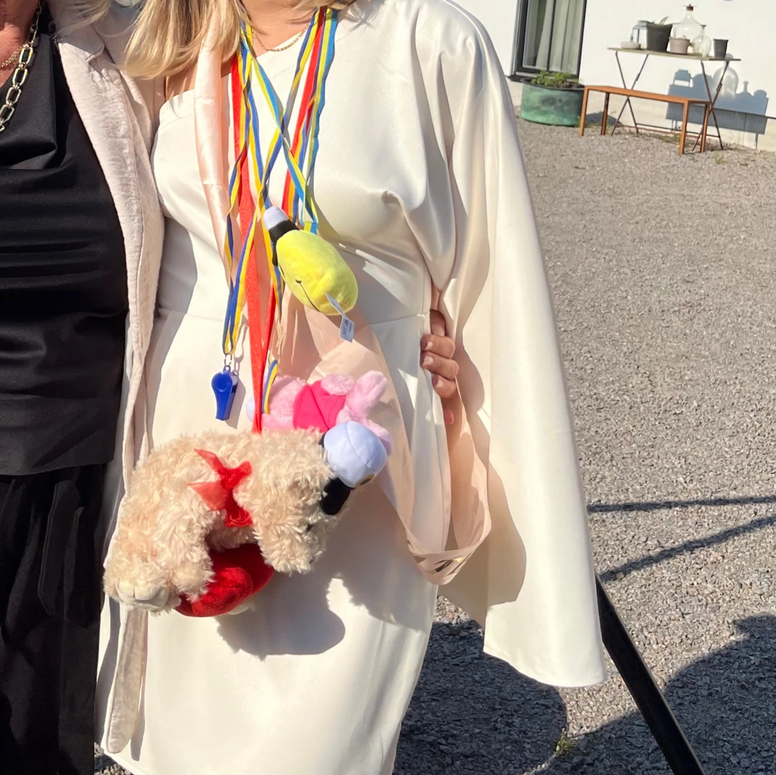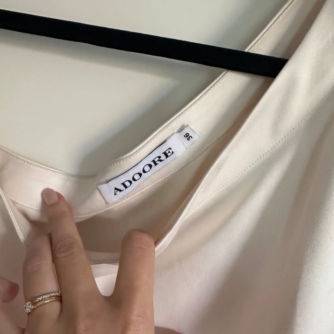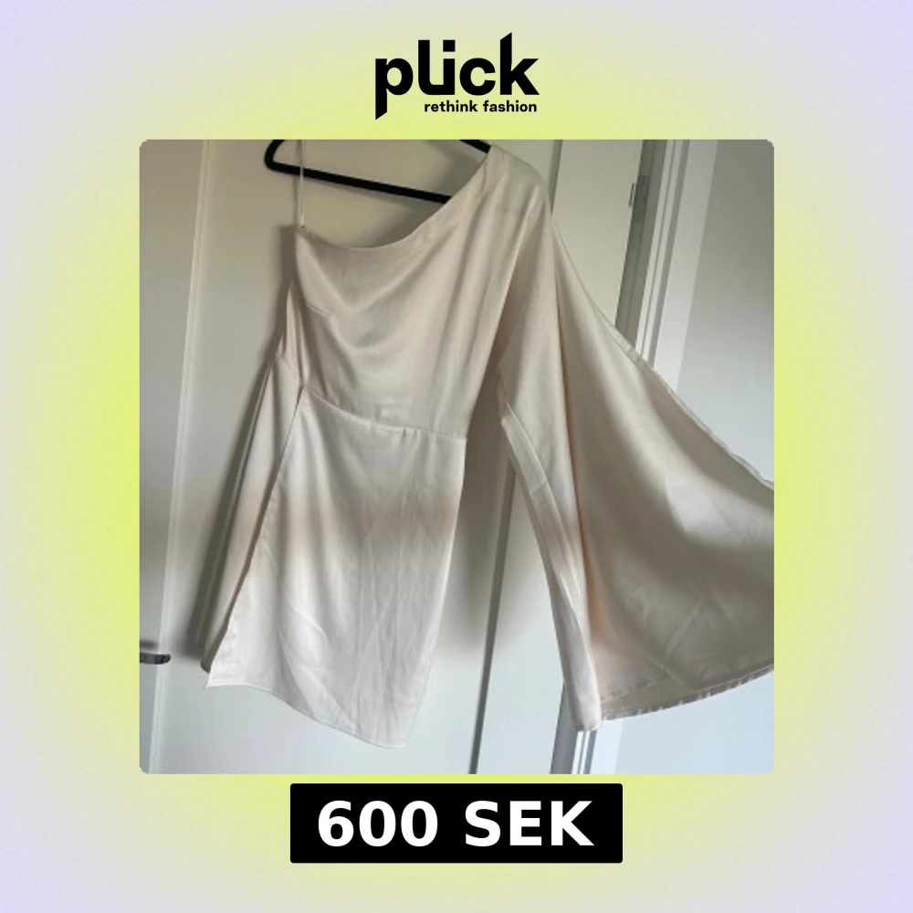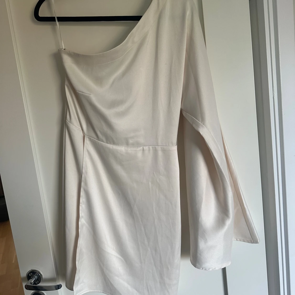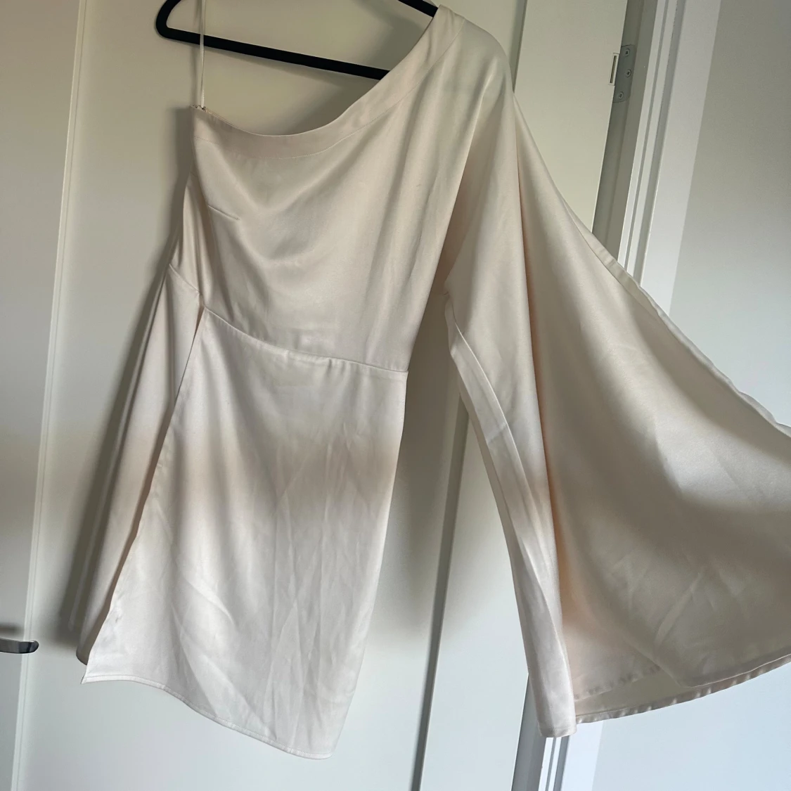 Snygg kortklänning från Adoore i champagnefärgad satin med oneshoulder-design och en lång, vid ärm. Stilren och modern look med slät yta och lätt glans. Säljer i befintligt skick så KAN finnas någon liten fläck. Varsamt använt.