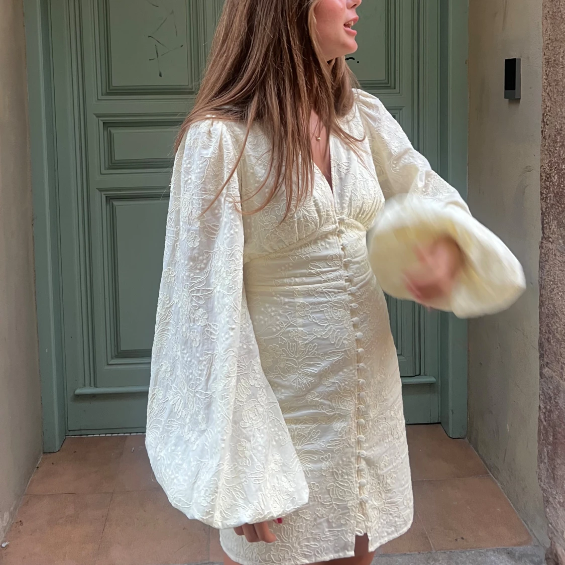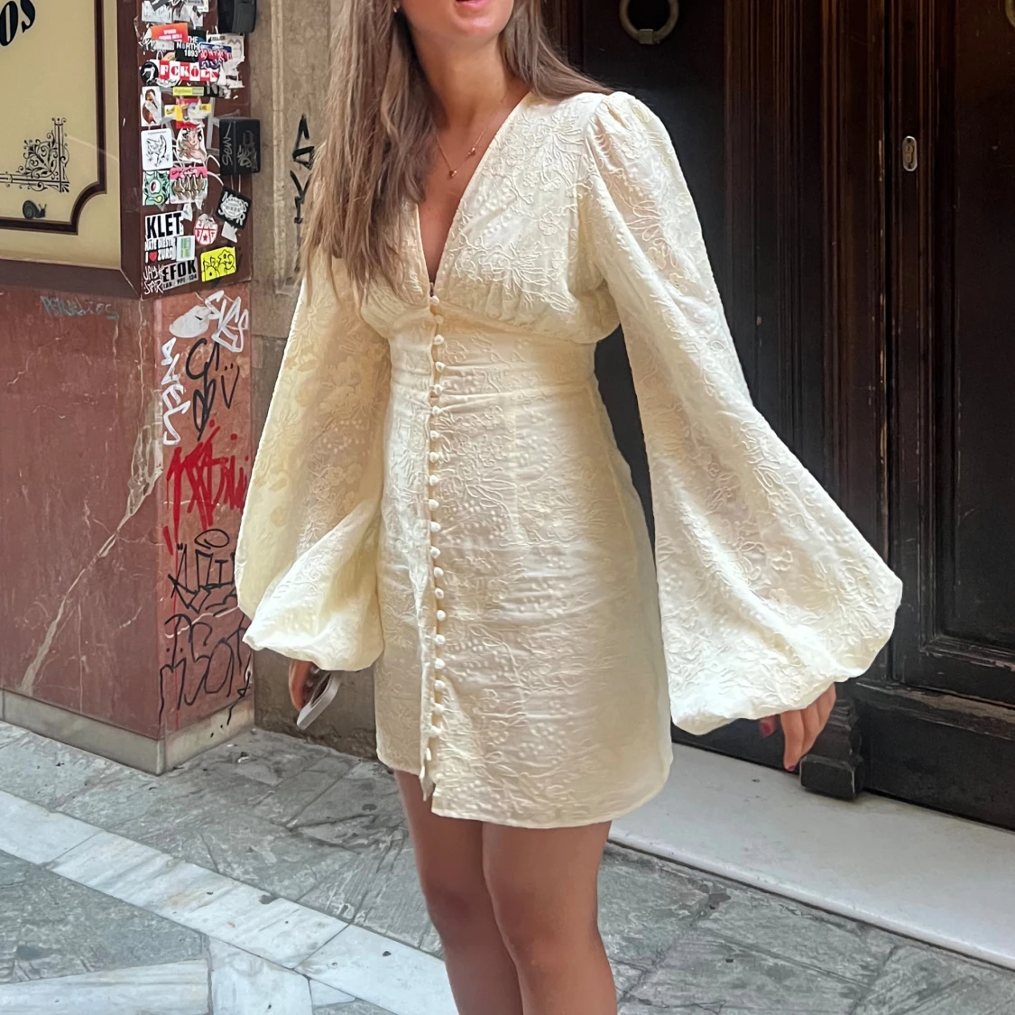 Säljer min fina adoore klänning. Änvänd 3 gånger. Tappat 2 knappar längst ner därav priset! Men tror man kan beställa eller få nya knappar på adoore. Men som ni ser på bilden så märker man inte av det. 😊 den är gul/ beige