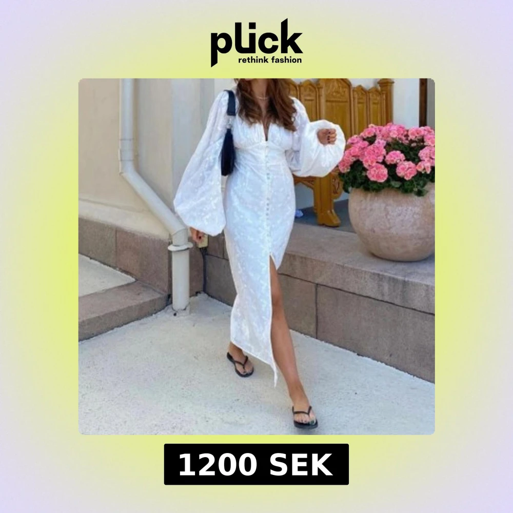 Elegant vit långklänning med subtilt blommönster och långa puffärmar. Klänningen har en djup v-ringning och en slits framtill som ger en stilfull touch. Perfekt för sommarens festligheter.