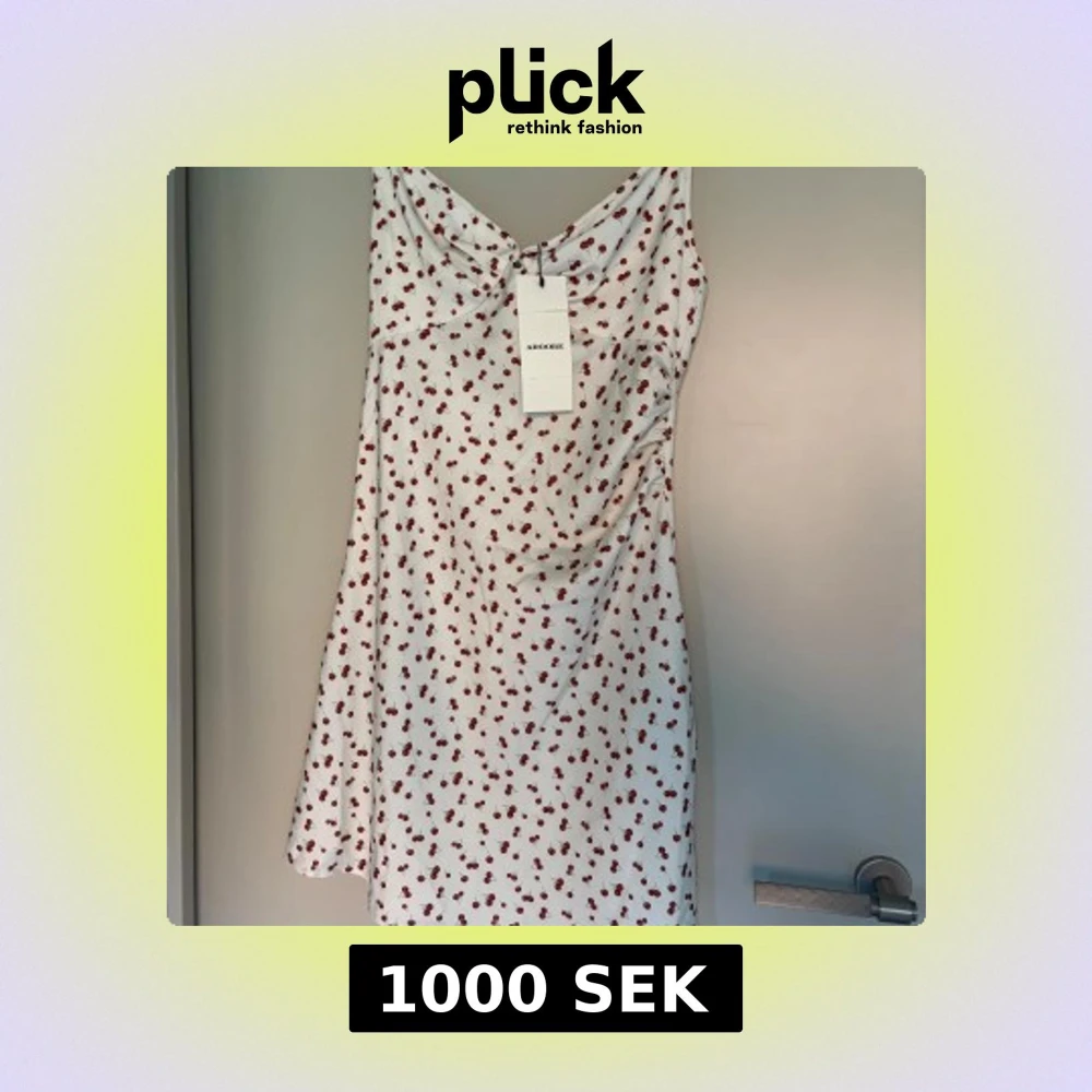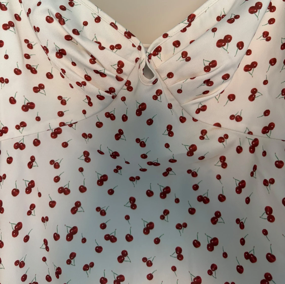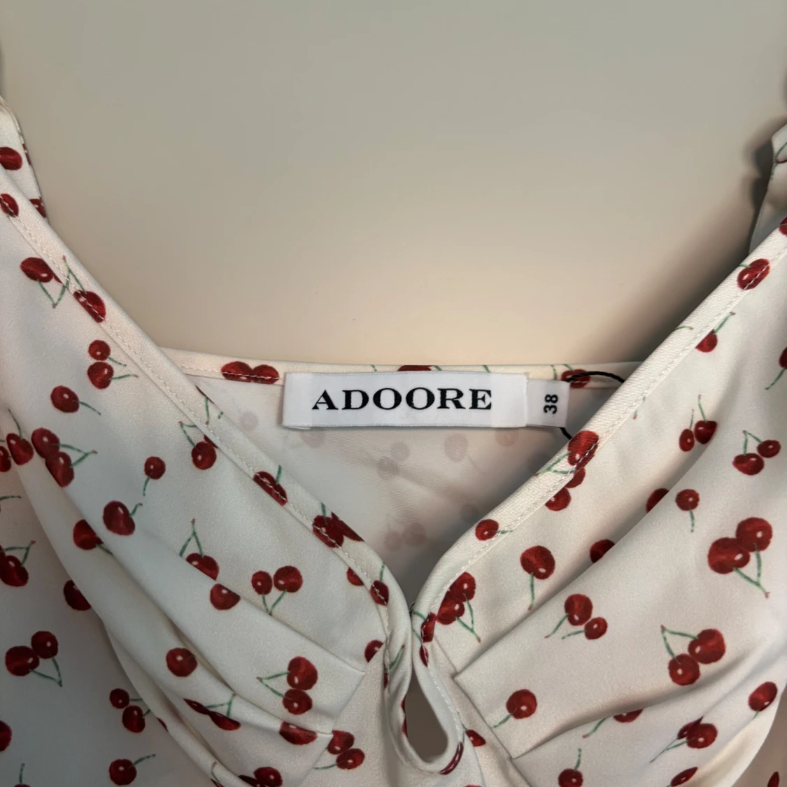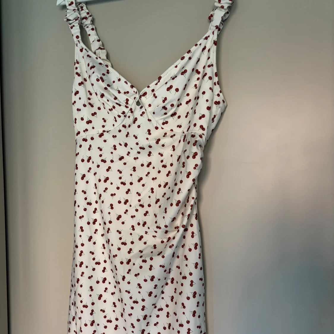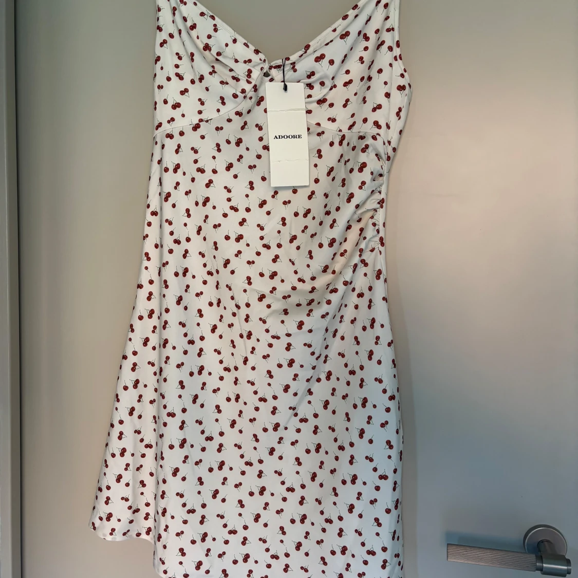 Supersöt vit klänning från Adoore med röda körsbär över hela tyget. Klänningen har smala axelband, lätt rynk vid bysten och en feminin, figurnära passform. Perfekt för sommaren!!