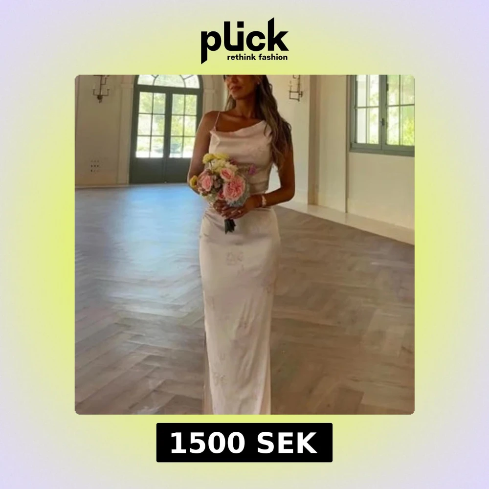 Elegant ljusrosa långklänning med smala axelband och draperad urringning. Klänningen har en figurnära passform och subtilt blommönster i tyget. Tillverkad i glansigt satinliknande material som ger en lyxig känsla. Klänningen är lite insydd i midjan hos skräddare, då jag ville ha en lång klänning tog jag en storlek större men sydde in i midjan