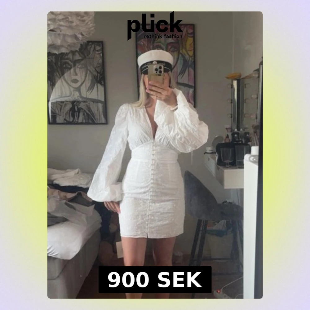 Säljer nu min vita studentklänning från adoore med djup v-ringning och stora puffärmar. Klänningen har knappar framtill och markerad midja. Knappen längst ner har ramlat av men tycker att man inte tänker på de! Perfekt till student eller sommarens festligheter.