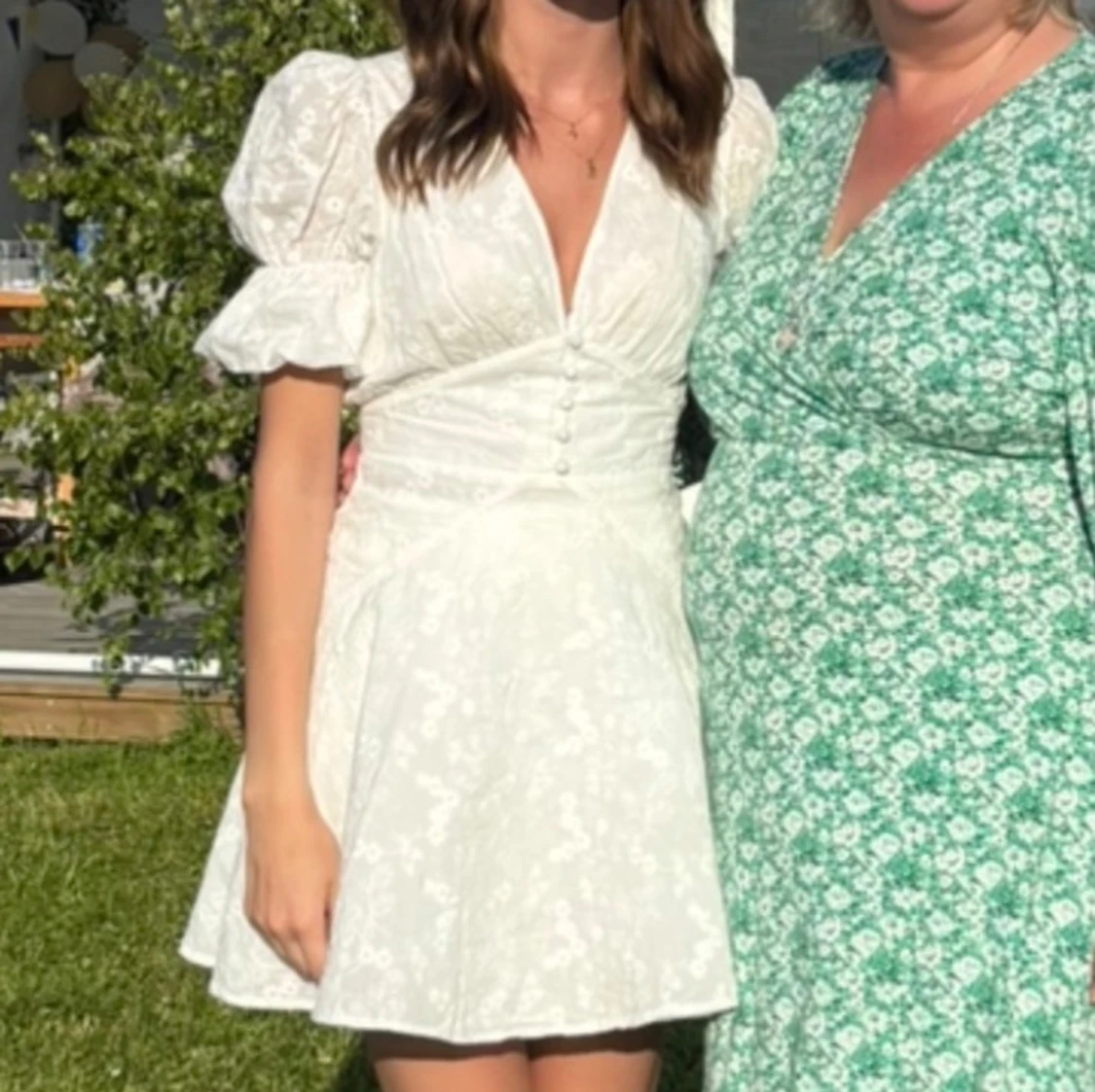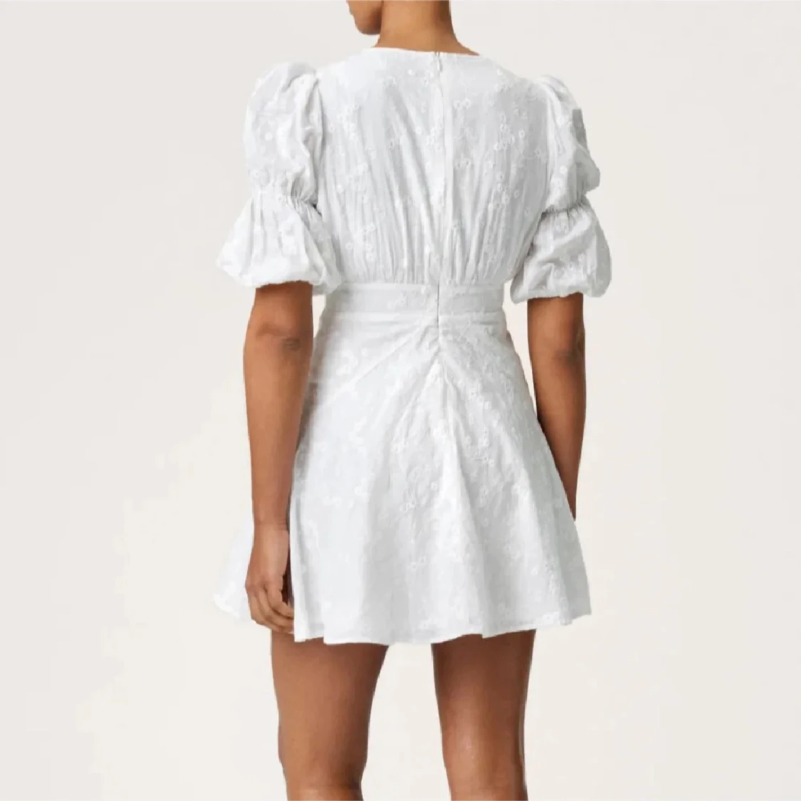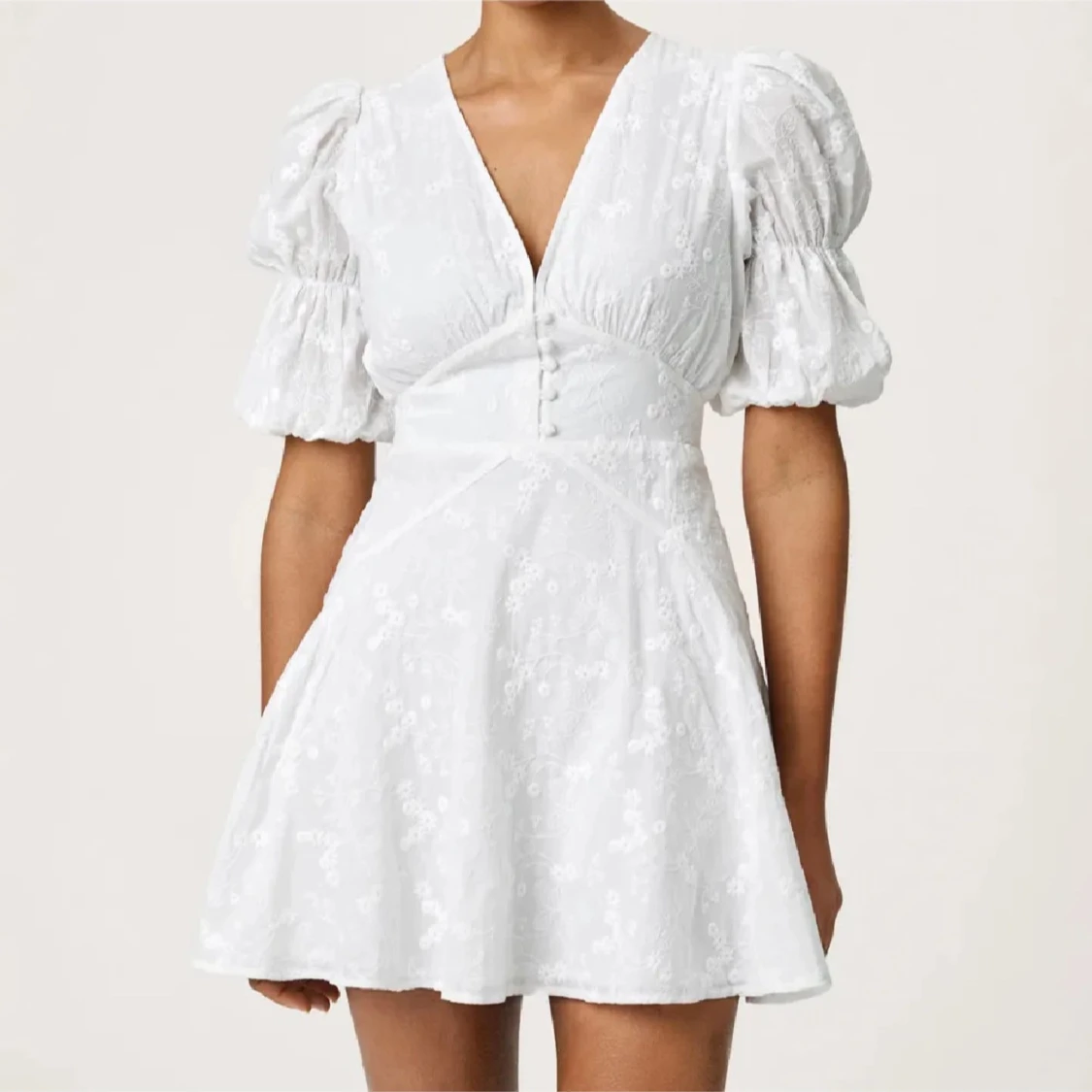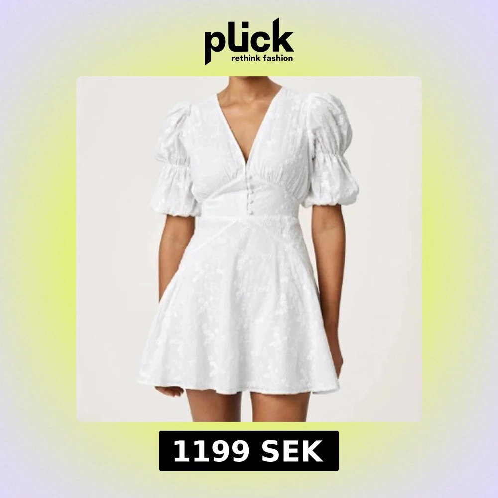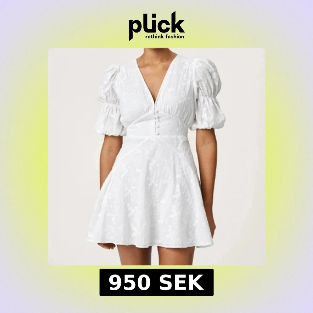 Klänning från adoore. Superfin vit kort klänning med v-ringning, puffiga korta ärmar och markerad midja. Klänningen har broderade blommor, knappar framtill och lätt utsvängd kjol. Perfekt för sommarens alla tillfällen. Använd en gång i bara några timmar, alla kanppar kvar och är som ny 🩷nypris 1495