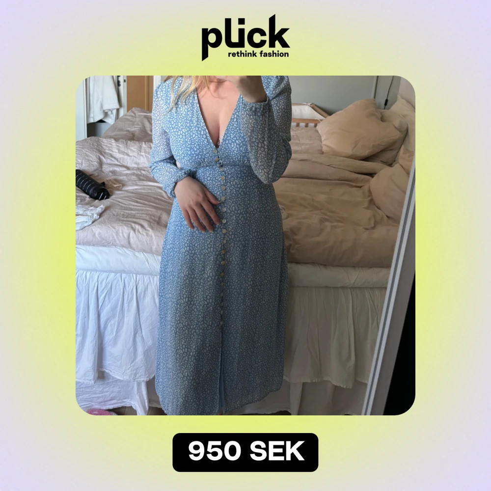 Säljer en superfin blå klänning med ett jättefint mönster och knappar hela vägen ner. Den har långa ärmar och en v-ringad design. Säljer pga att den är för liten 😢 Endast använd vid 2 tillfällen så den är i jättefint skick!🩵 Skulle säga att den är liten i storleken. Nypris 1495kr