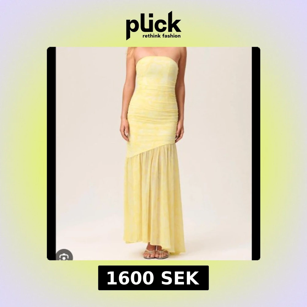 Modell Limoges från adoore förra årets kollektion Superfin axelbandslös långklänning i ljusgul nyans med subtilt mönster. Klänningen har figurnära passform upptill, rynkade detaljer och en asymmetrisk volang nedtill. Perfekt för sommarens alla tillfällen när du vill sticka ut lite extra