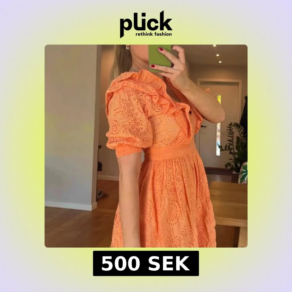 Superfin persikofärgad / orange kortklänning med broderade detaljer och volanger längs v-ringningen. Puffiga korta ärmar och markerad midja. Säljer för jag har två likadana!💕