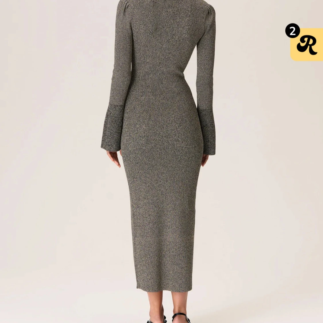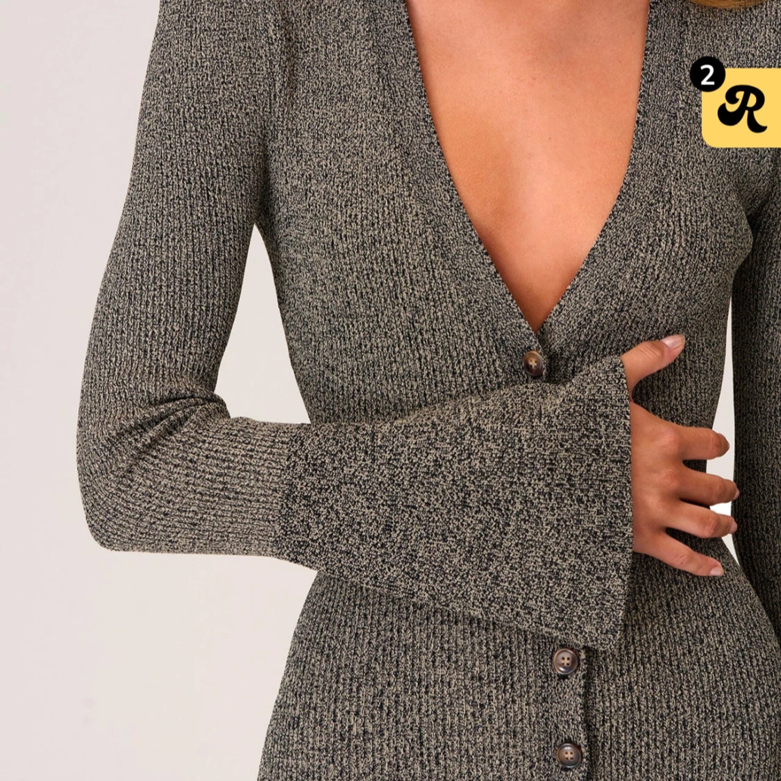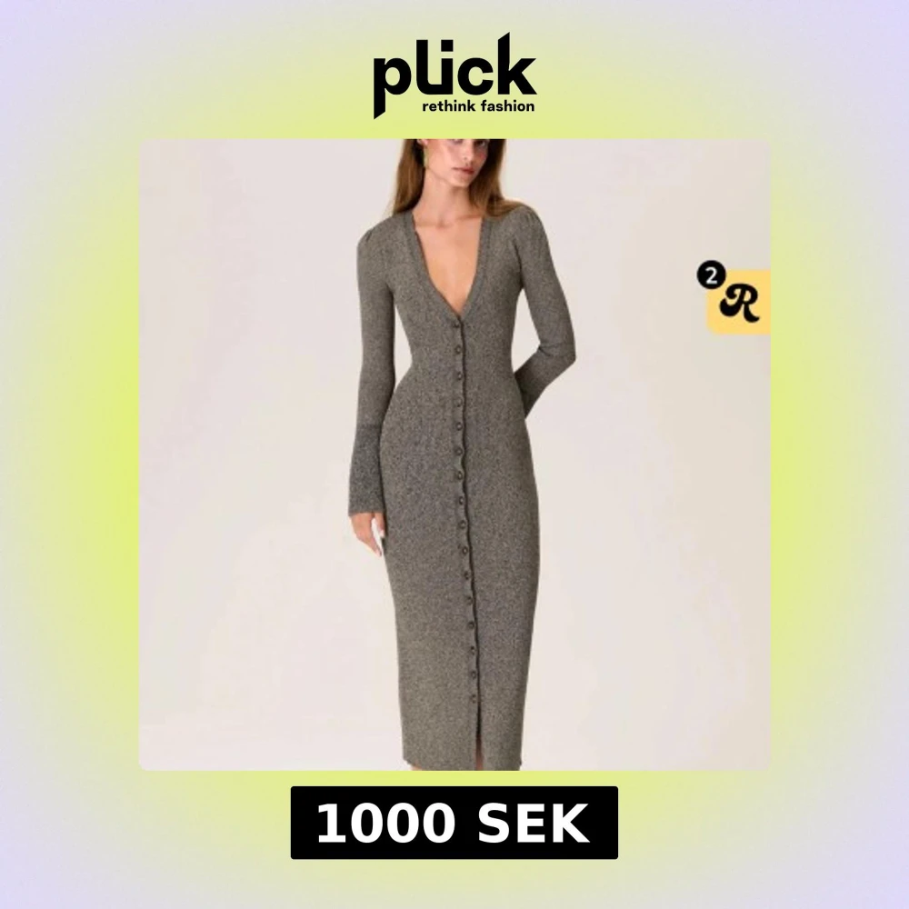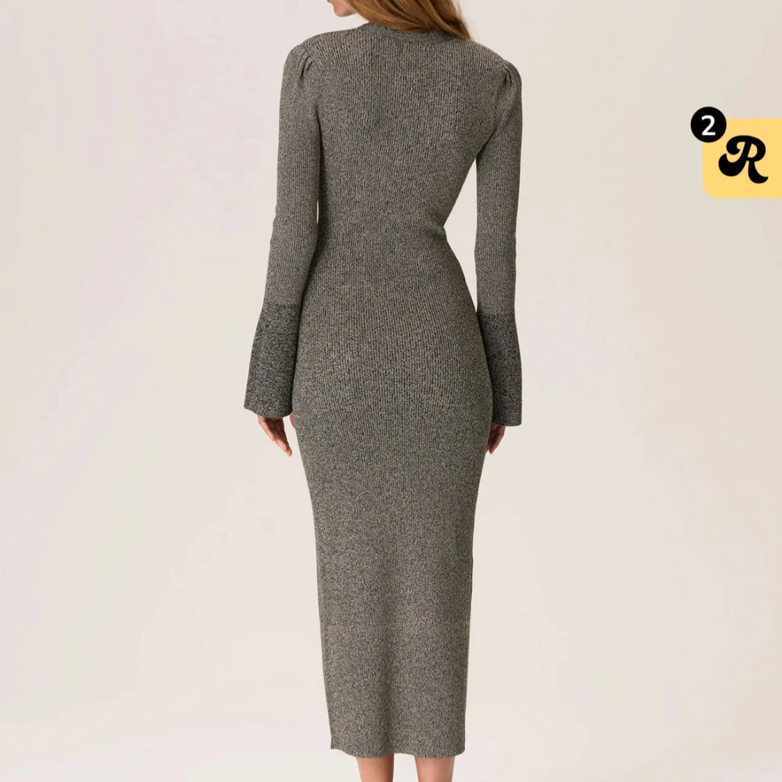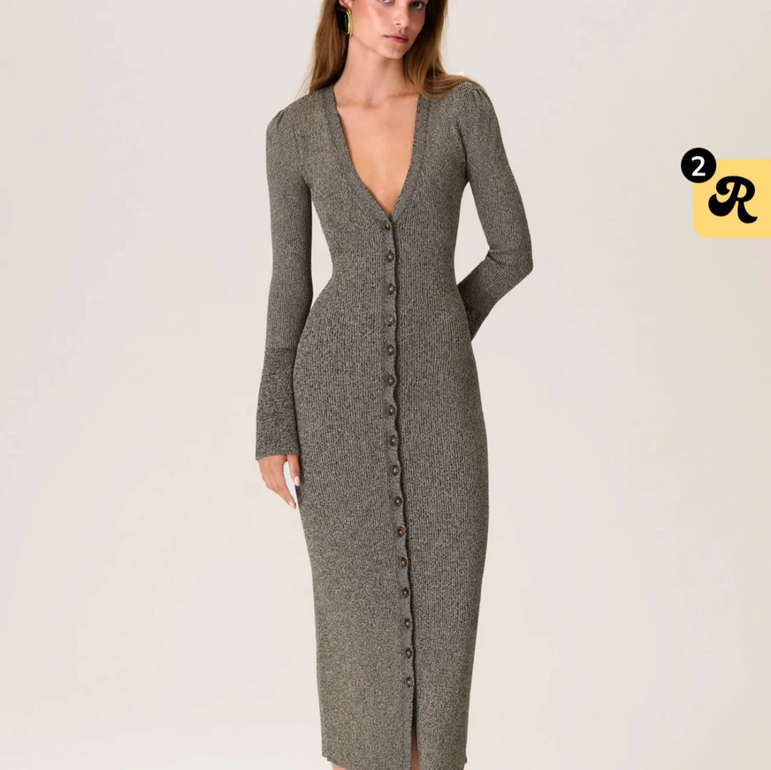 Snygg grå stickad klänning med v-ringning och knappar hela vägen ner. Långärmad design med en smickrande passform och slits framtill. Storlek 36