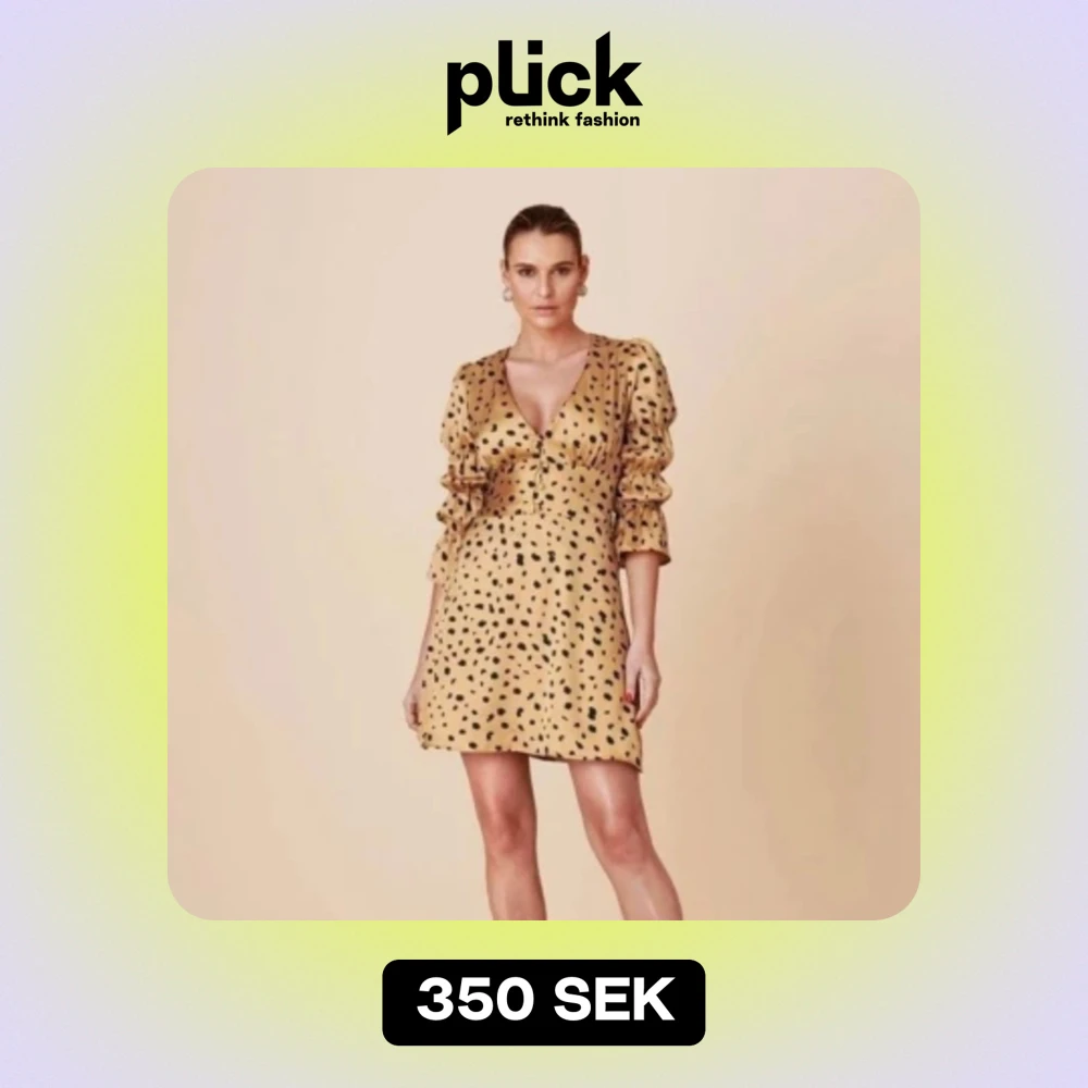 En vacker klänning med prickigt mönster i beige och svart från Adoore. Klänningen har en V-ringning och är figursydd. Den har också en knappstängning i fram och är perfekt för en festlig tillställning. OBS oanvänd med etiketter!