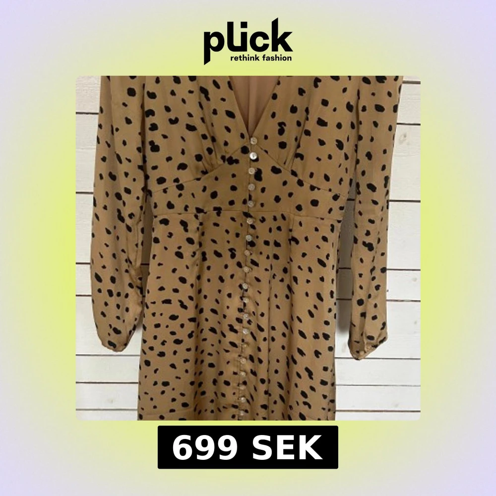Säljer en beige långärmad klänning med svarta prickar och djup v-ringning. Klänningen har knappar längs hela framsidan och markerad midja. Perfekt för dig som gillar trendiga mönster och en feminin siluett.