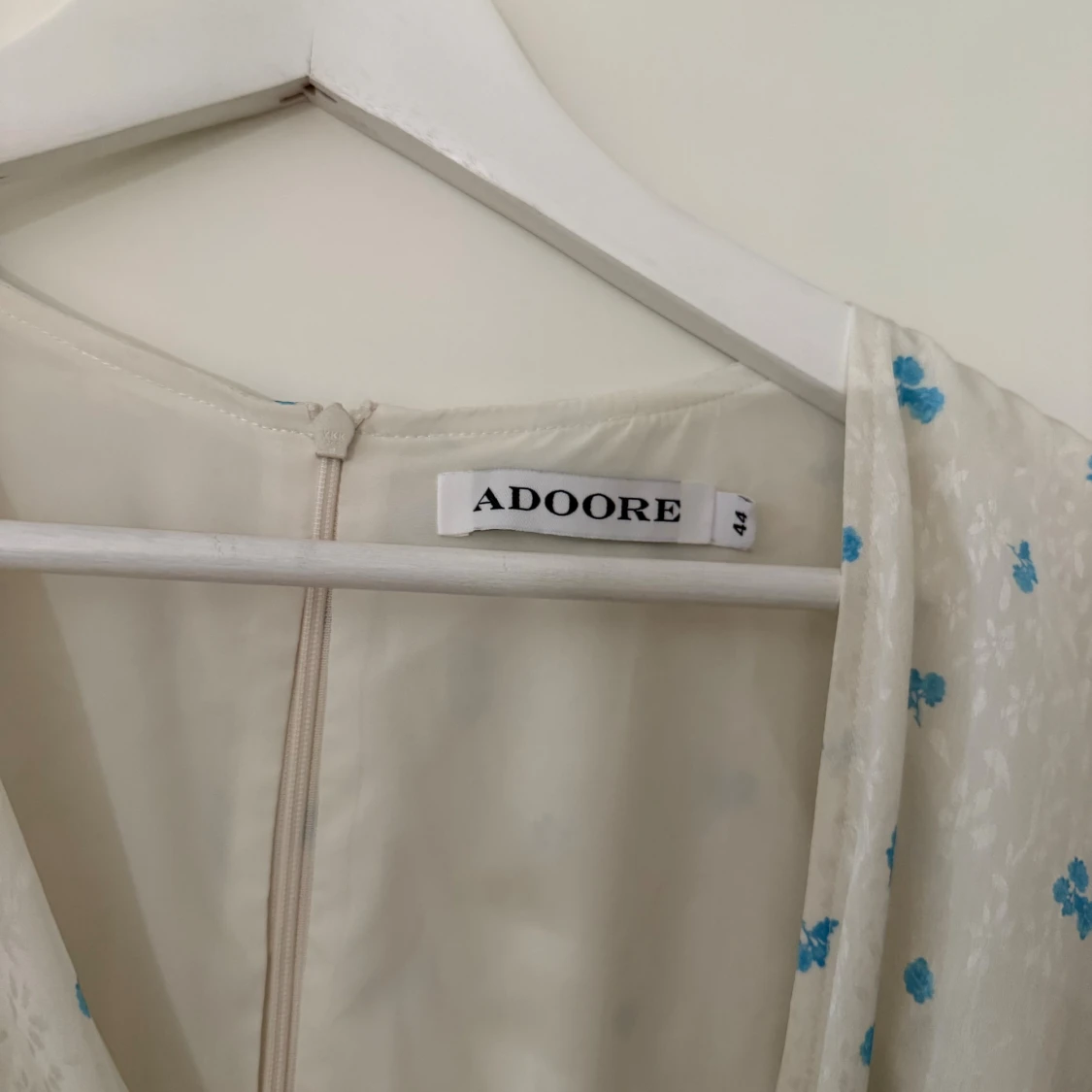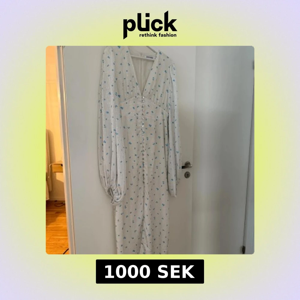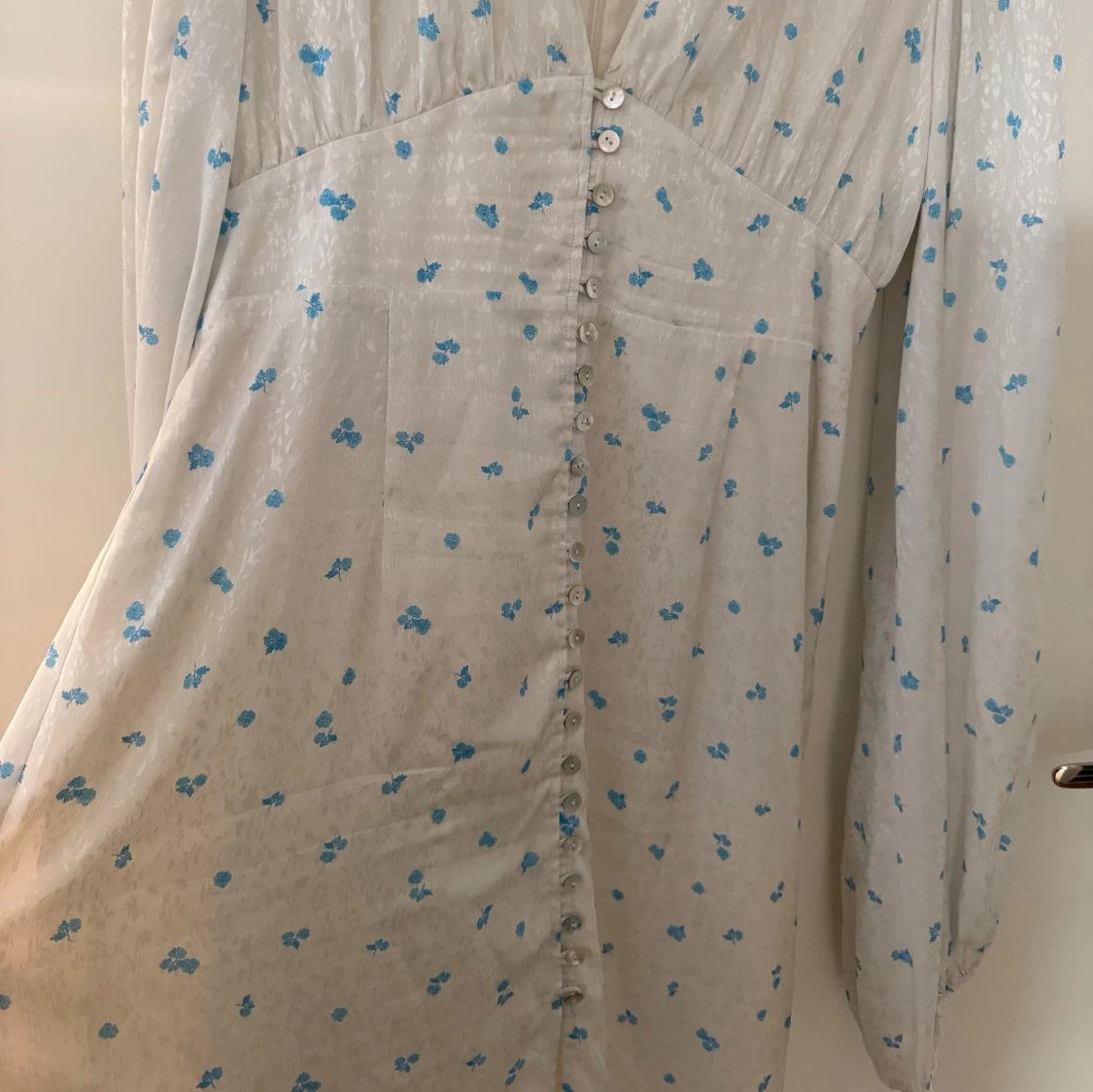 Supersöt långklänning från Adoore i vit med små blå blommor. Klänningen har v-ringning, långa puffärmar och knappar hela vägen framtill. Materialet är glansigt och känns lyxigt, perfekt för dig som gillar romantiska detaljer och blommigt. Hör av dig vid intresse 🌸🌟🙌🏼