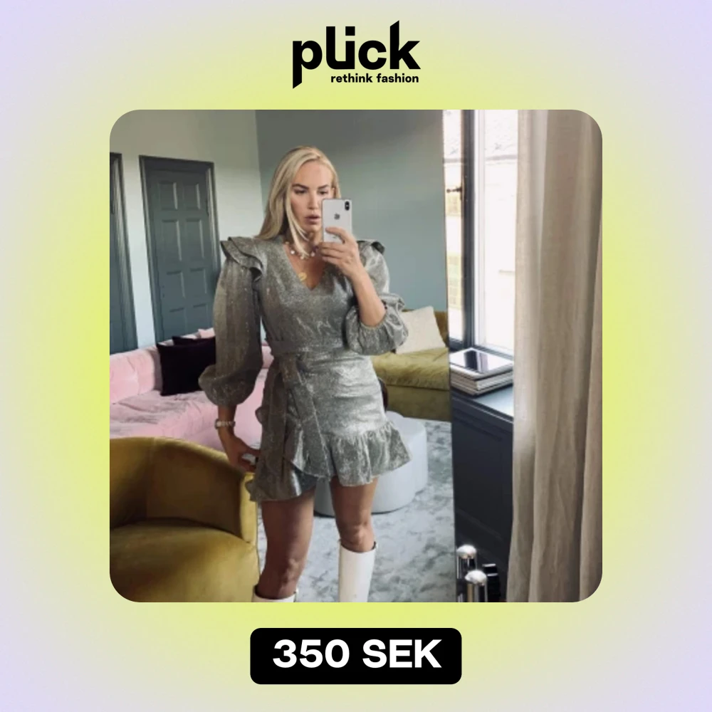 Snygg glittrig klänning med puffärmar och v-ringning från Adoore. Klänningen är i en mjukt fallande modell med en liten volang i nederkant. Den har en fin detalj med en snörning i midjan. OBS oanvänd med etiketter på!