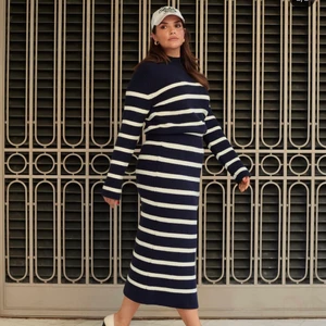 Stickad blå/vit randig klänning från Adoore. Endast använd en gång, nypris 1595kr. Storlek small.