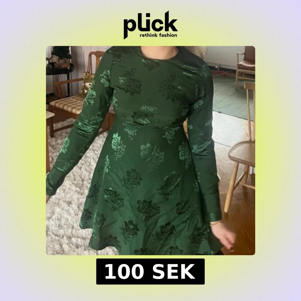 Snygg grön klänning med blommigt mönster. Den har långa ärmar som knäpps vid handlederna. Klänningen är tillverkad i ett mjukt silkesliknande material.