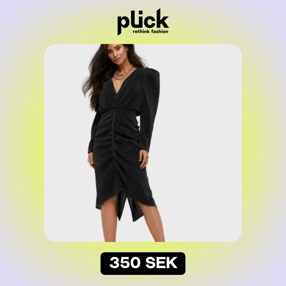 Snygg svart klänning med glittrande tyg och puffärmar. Klänningen har en djup V-ringning framtill som kan framhävas ytterligare genom att lossa öglan och en öppen rygg. Den är figursydd och har en längd som når strax över knäna. Oanvänd.
