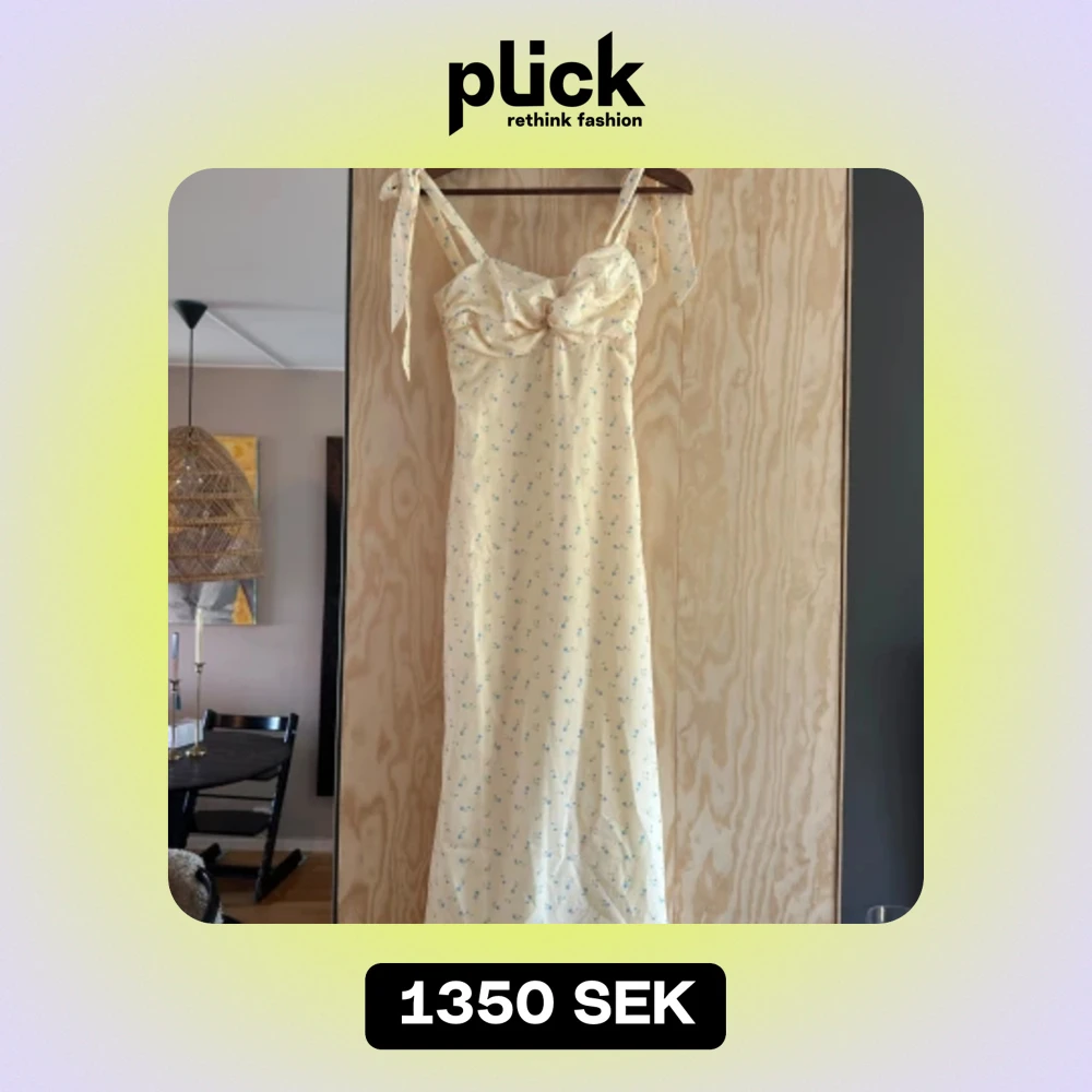 Superfin ljusgul figursydd långklänning från Adoore med små ljusblåa blommor på. Storlek XXS/32. Helt ny, enbart testad