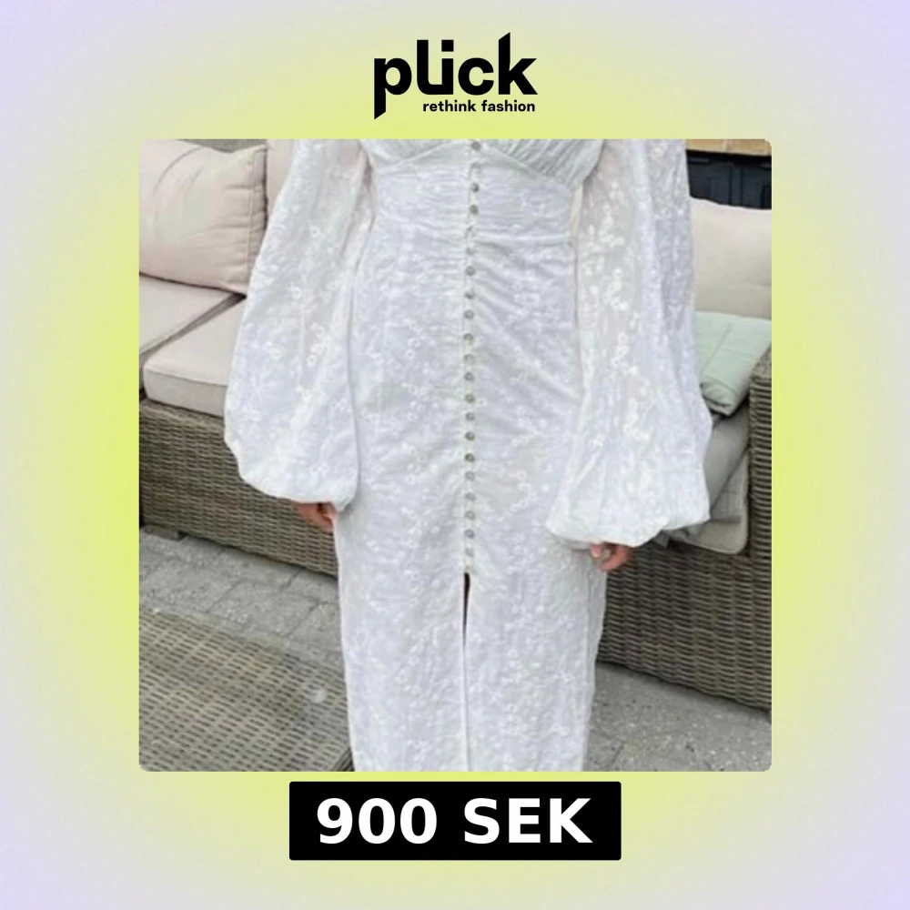 Superfin vit långklänning med v-ringning, puffiga långärmar och dekorativa knappar framtill. Klänningen har ett subtilt blommigt mönster och markerad midja. Perfekt för sommarens speciella tillfällen.