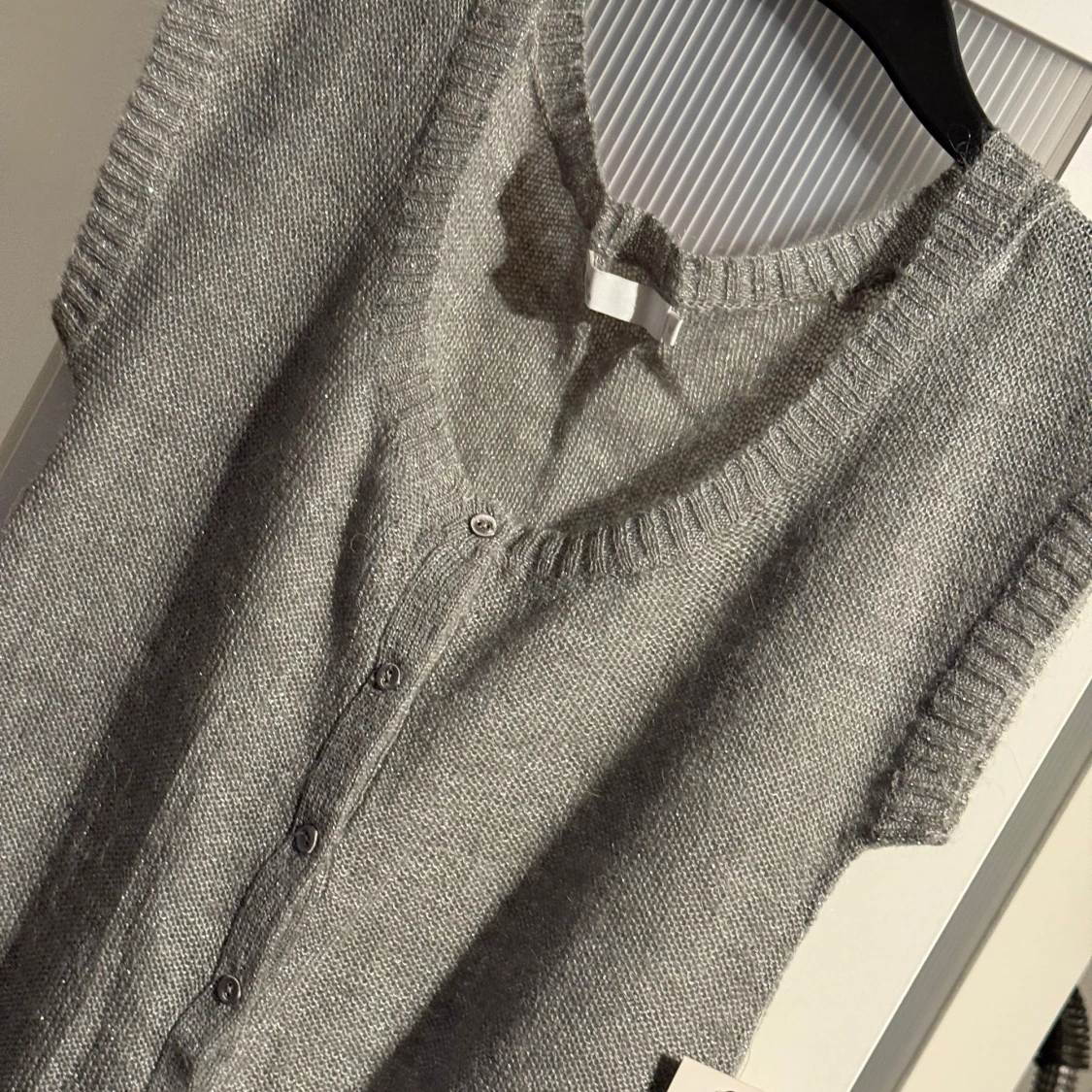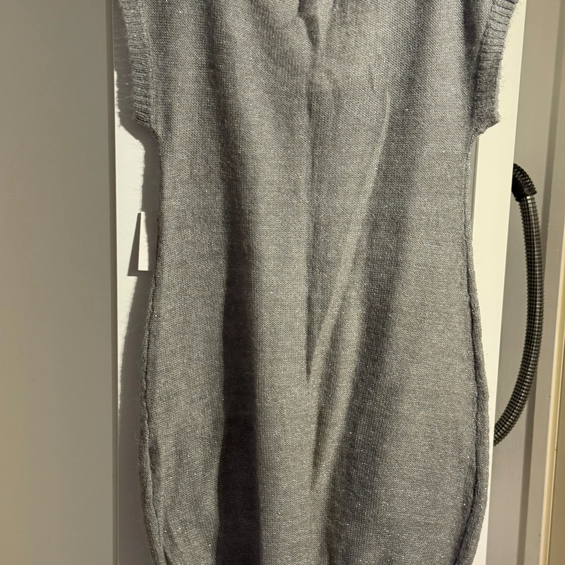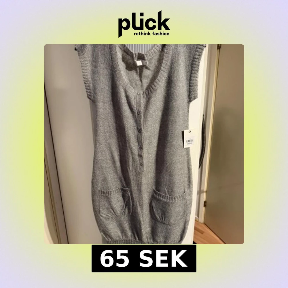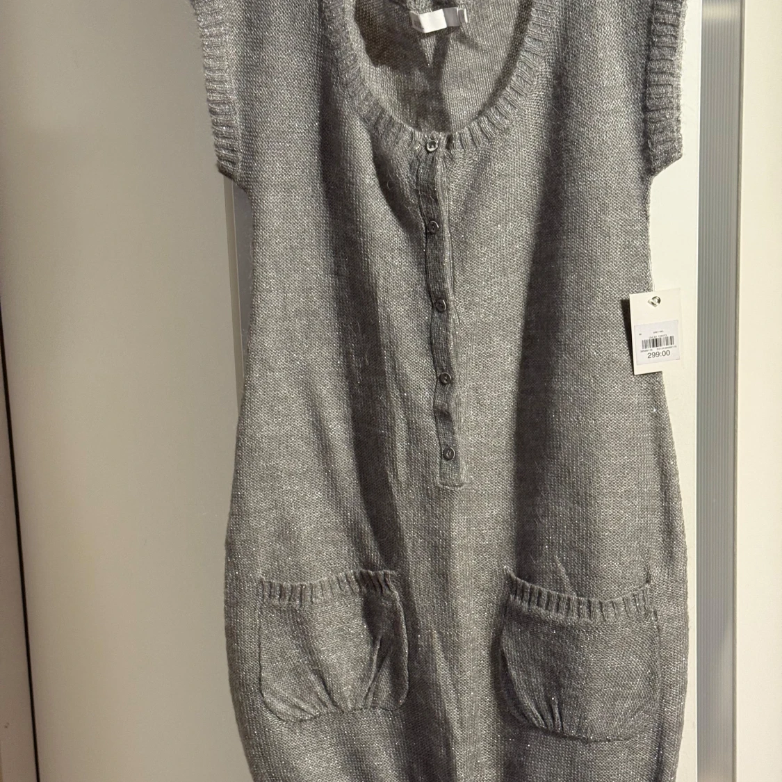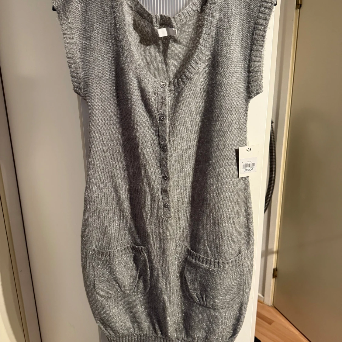Grå stickad klänning med v-ringning, knappar framtill och två stora fickor. Ärmlös modell med ribbade kanter och mjukt material som känns både chill och snygg. Perfekt att styla med boots eller sneakers för en cool look.