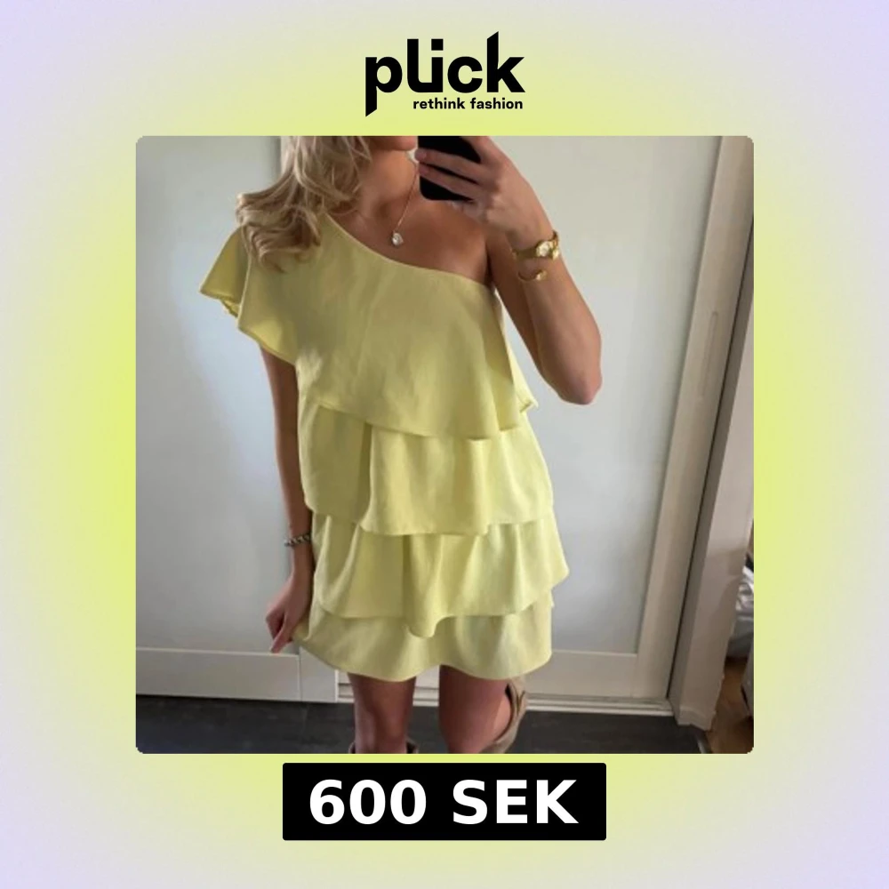 KOM MED PRISFÖRSLAG!! Säljer en ljusgul kortklänning med flera lager volanger och oneshoulder-design. Klänningen har en luftig och flowy passform, perfekt för sommarens varma dagar. Materialet känns lätt och svalt mot huden och ger en fräsch vibe. Väldigt populär och trendig.