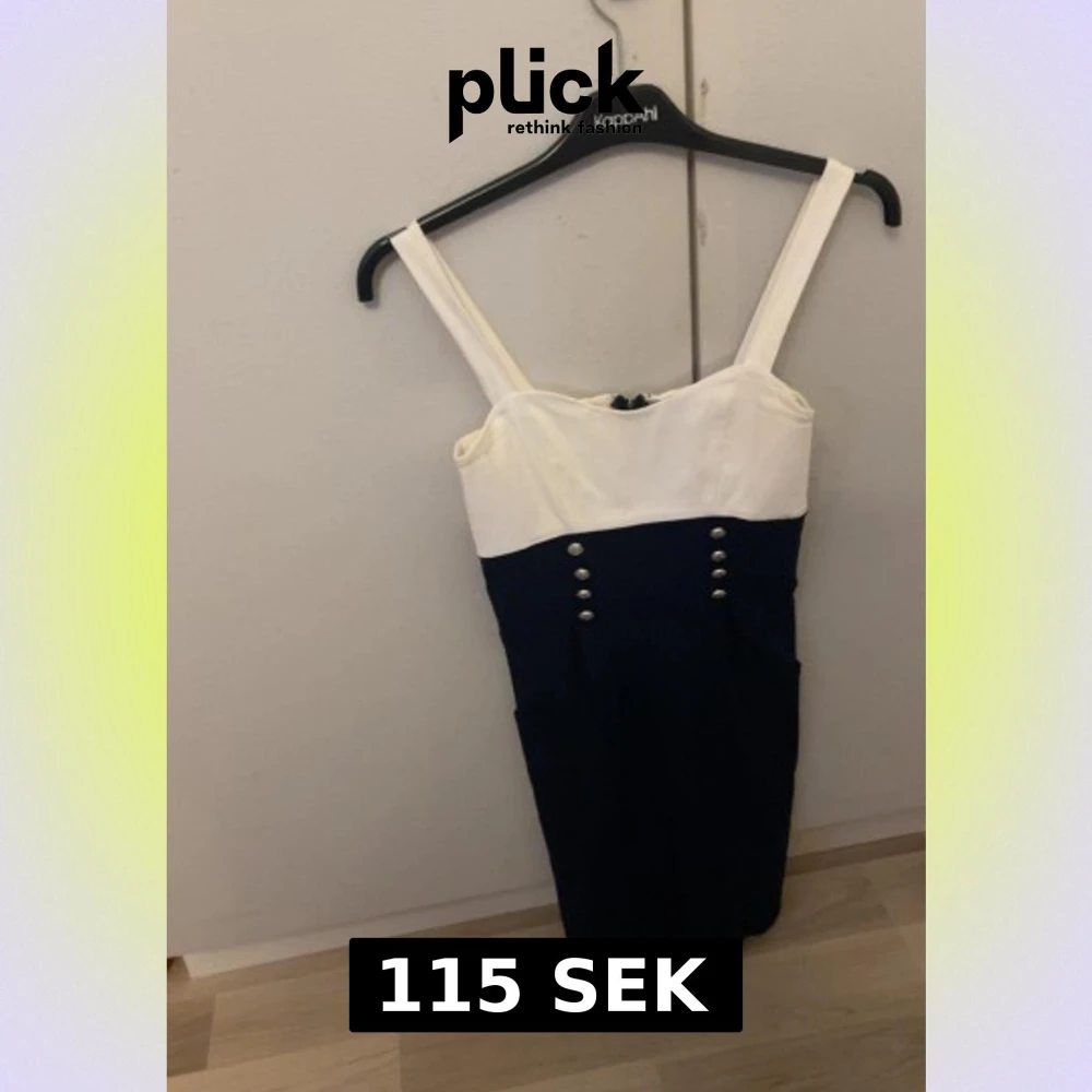 Snygg kort klänning med breda axelband. Överdelen är vit och nederdelen marinblå, dekorerad med åtta silvriga knappar framtill. Klänningen har en figurnära passform och dragkedja bak. Perfekt för dig som gillar stilren och klassisk look.