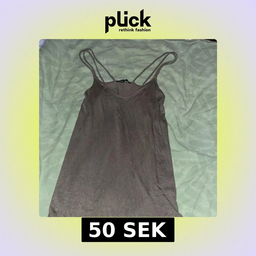 Säljer en enkel brun/grön klänning med smala axelband och v-ringning. Perfekt för en avslappnad stil. Tillverkad i ett mjukt och bekvämt material.